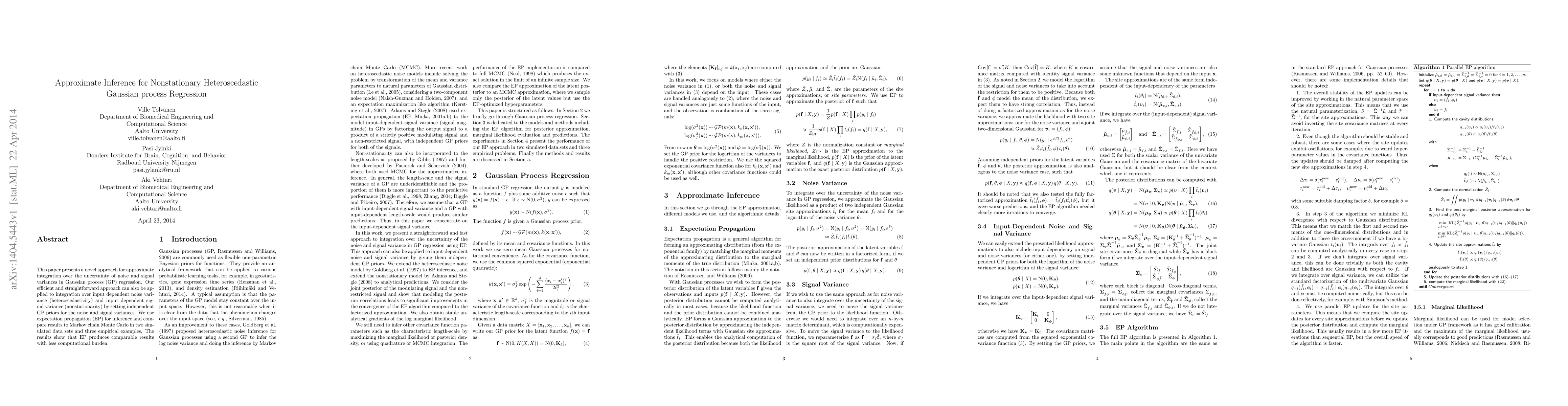 This paper introduces an efficient method for approximate inference in Gaussian process regression with nonstationary and heteroscedastic noise. It employs expectation propagation for faster results compared to Markov chain Monte Carlo, validated through both simulated and empirical data.