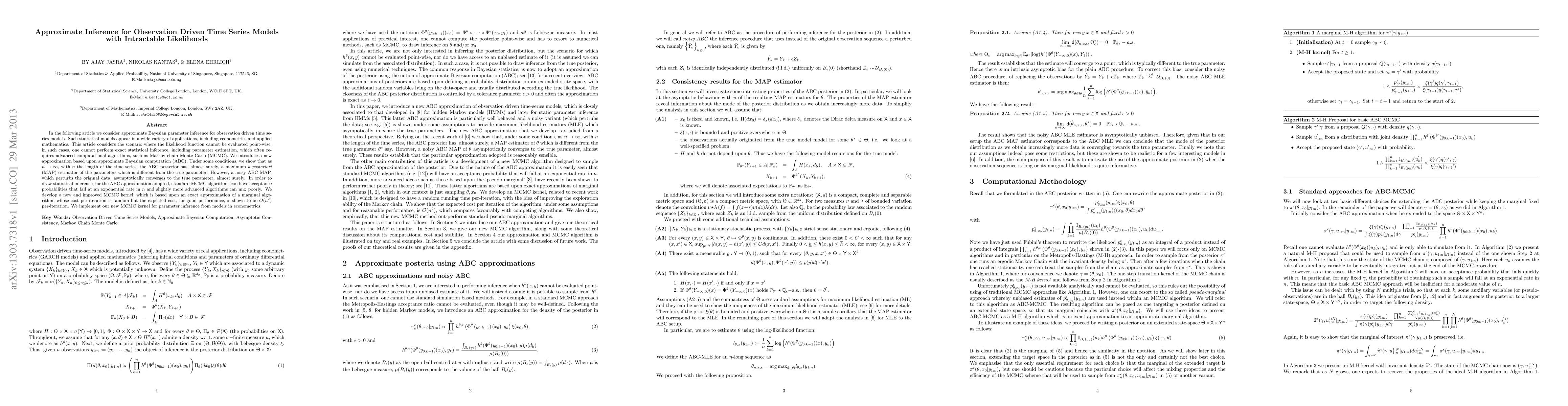 In the following article we consider approximate Bayesian parameter inference for observation driven time series models. Such statistical models appear in a wide variety of applications, including econometrics and applied mathematics. This article considers the scenario where the likelihood function cannot be evaluated point-wise; in such cases, one cannot perform exact statistical inference, including parameter estimation, which often requires advanced computational algorithms, such as Markov chain Monte Carlo (MCMC). We introduce a new approximation based upon approximate Bayesian computation (ABC). Under some conditions, we show that as $n\rightarrow\infty$, with $n$ the length of the time series, the ABC posterior has, almost surely, a maximum \emph{a posteriori} (MAP) estimator of the parameters which is different from the true parameter. However, a noisy ABC MAP, which perturbs the original data, asymptotically converges to the true parameter, almost surely. In order to draw statistical inference, for the ABC approximation adopted, standard MCMC algorithms can have acceptance probabilities that fall at an exponential rate in $n$ and slightly more advanced algorithms can mix poorly. We develop a new and improved MCMC kernel, which is based upon an exact approximation of a marginal algorithm, whose cost per-iteration is random but the expected cost, for good performance, is shown to be $\mathcal{O}(n^2)$ per-iteration.