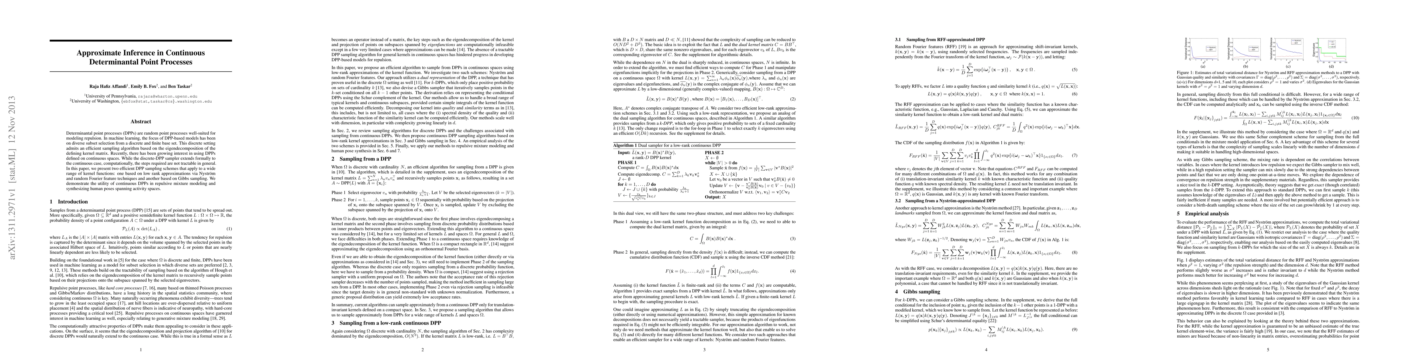 This paper introduces two efficient sampling methods for continuous determinantal point processes (DPPs), addressing the computational challenge of sampling in continuous spaces. The methods leverage low-rank approximations and Gibbs sampling, demonstrating their application in mixture modeling and human pose synthesis.