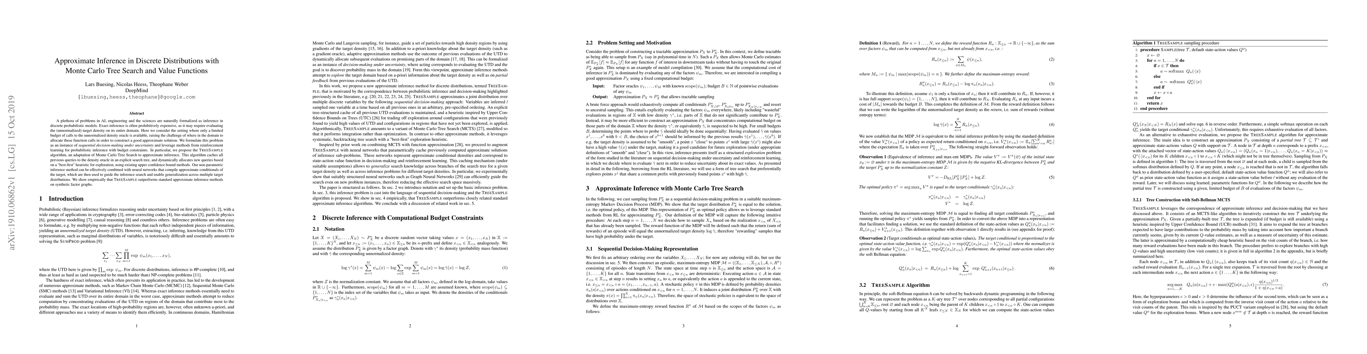 A plethora of problems in AI, engineering and the sciences are naturally formalized as inference in discrete probabilistic models. Exact inference is often prohibitively expensive, as it may require evaluating the (unnormalized) target density on its entire domain. Here we consider the setting where only a limited budget of calls to the unnormalized density oracle is available, raising the challenge of where in the domain to allocate these function calls in order to construct a good approximate solution. We formulate this problem as an instance of sequential decision-making under uncertainty and leverage methods from reinforcement learning for probabilistic inference with budget constraints. In particular, we propose the TreeSample algorithm, an adaptation of Monte Carlo Tree Search to approximate inference. This algorithm caches all previous queries to the density oracle in an explicit search tree, and dynamically allocates new queries based on a "best-first" heuristic for exploration, using existing upper confidence bound methods. Our non-parametric inference method can be effectively combined with neural networks that compile approximate conditionals of the target, which are then used to guide the inference search and enable generalization across multiple target distributions. We show empirically that TreeSample outperforms standard approximate inference methods on synthetic factor graphs.