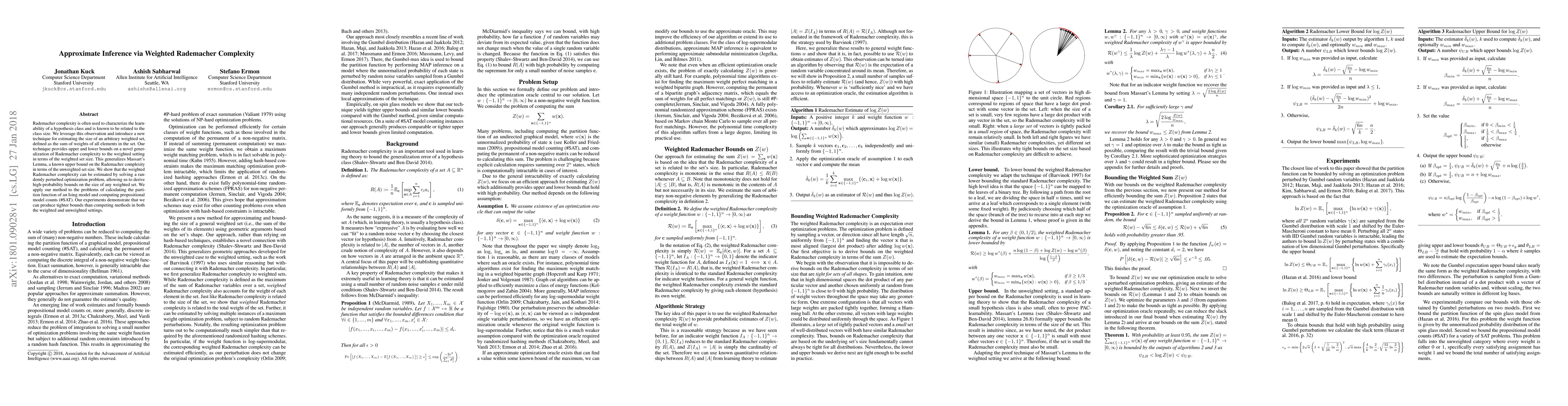 Rademacher complexity is often used to characterize the learnability of a hypothesis class and is known to be related to the class size. We leverage this observation and introduce a new technique for estimating the size of an arbitrary weighted set, defined as the sum of weights of all elements in the set. Our technique provides upper and lower bounds on a novel generalization of Rademacher complexity to the weighted setting in terms of the weighted set size. This generalizes Massart's Lemma, a known upper bound on the Rademacher complexity in terms of the unweighted set size. We show that the weighted Rademacher complexity can be estimated by solving a randomly perturbed optimization problem, allowing us to derive high-probability bounds on the size of any weighted set. We apply our method to the problems of calculating the partition function of an Ising model and computing propositional model counts (#SAT). Our experiments demonstrate that we can produce tighter bounds than competing methods in both the weighted and unweighted settings.