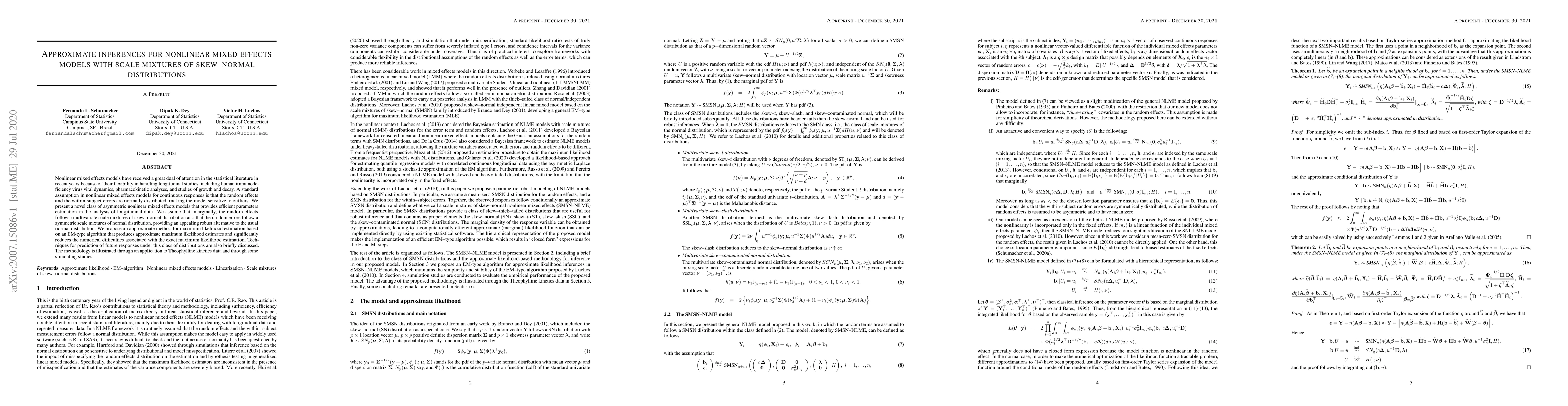 This paper introduces a novel class of asymmetric nonlinear mixed effects models using scale mixtures of skew-normal distributions for robust parameter estimation in longitudinal data analysis. An approximate EM-type algorithm is proposed to efficiently estimate parameters and facilitate future response predictions, demonstrated through Theophylline kinetics data and simulation studies.
