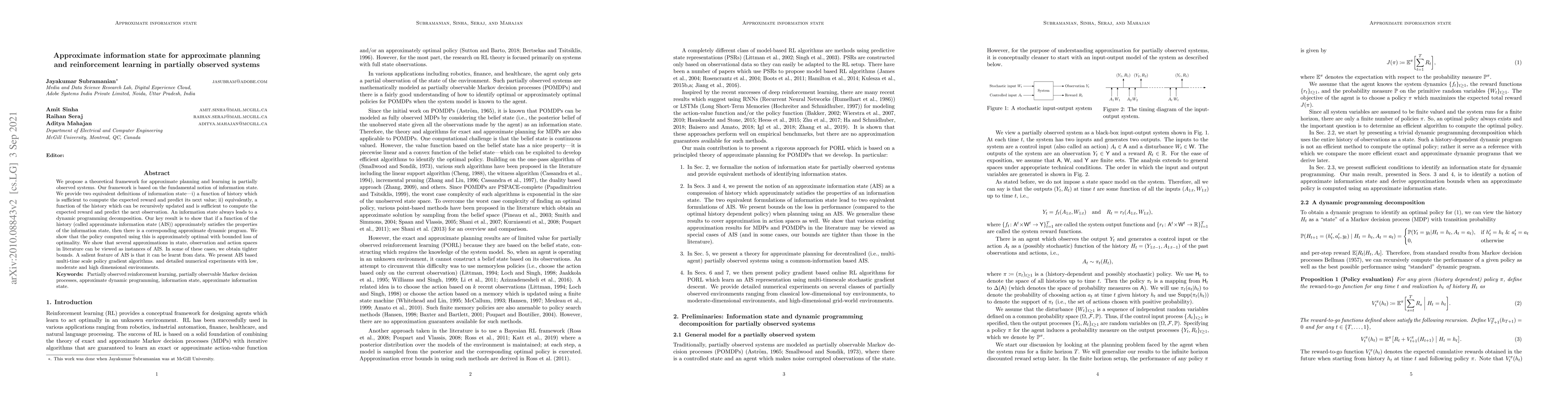 Researchers propose a theoretical framework for approximate planning and learning in partially observed systems, introducing the concept of an Approximate Information State (AIS), which enables efficient learning from data and approximates optimal policies with bounded loss of optimality.