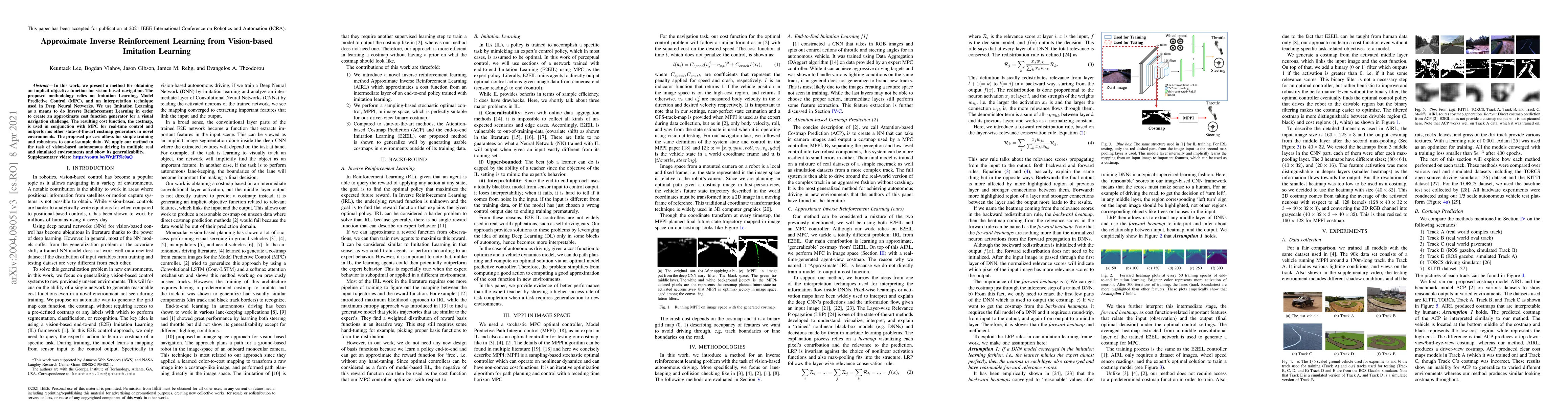 This paper proposes a method for vision-based navigation using Approximate Inverse Reinforcement Learning combined with Imitation Learning and Model Predictive Control. The resulting costmap outperforms other generators and demonstrates robustness and generalizability in autonomous driving tasks.