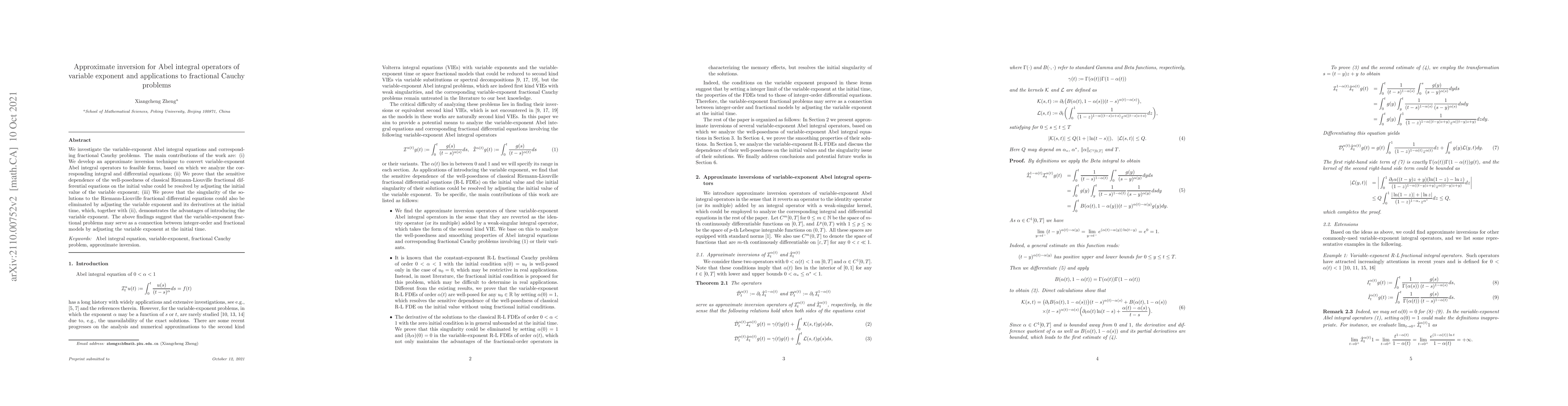 We investigate the variable-exponent Abel integral equations and corresponding fractional Cauchy problems. The main contributions of the work are enumerated as follows: (i) We develop an approximate inversion technique for variable-exponent Abel integral operators, based on which we analyze the corresponding integral and differential equations; (ii) We prove that the sensitive dependence of the well-posedness of classical Riemann-Liouville fractional differential equations on the initial value could be resolved by adjusting the initial value of the variable exponent; (iii) We prove that the singularity of the solutions to the Riemann-Liouville fractional differential equations could also be eliminated by adjusting the variable exponent and its derivatives at the initial time, which, together with (ii), demonstrates the advantages of introducing the variable exponent. The proposed approximate inversion technique provides a potential means to convert the intricate variable-exponent integral and differential problems to feasible forms, and the above findings suggest that the variable-exponent fractional problems may serve as a connection between integer-order and fractional models by adjusting the variable exponent at the initial time.