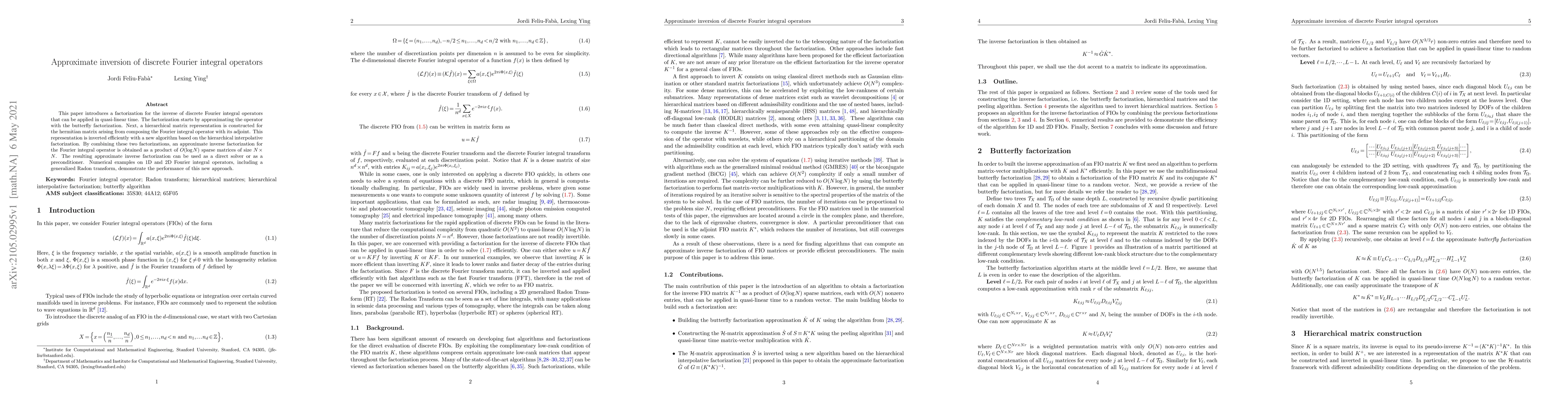 This paper presents an efficient quasi-linear time method for approximating the inverse of discrete Fourier integral operators, utilizing factorization and hierarchical matrix techniques to achieve a product of $O(\log N)$ sparse matrices. Numerical results show the effectiveness of the approach for solving 1D and 2D Fourier integral operators.
