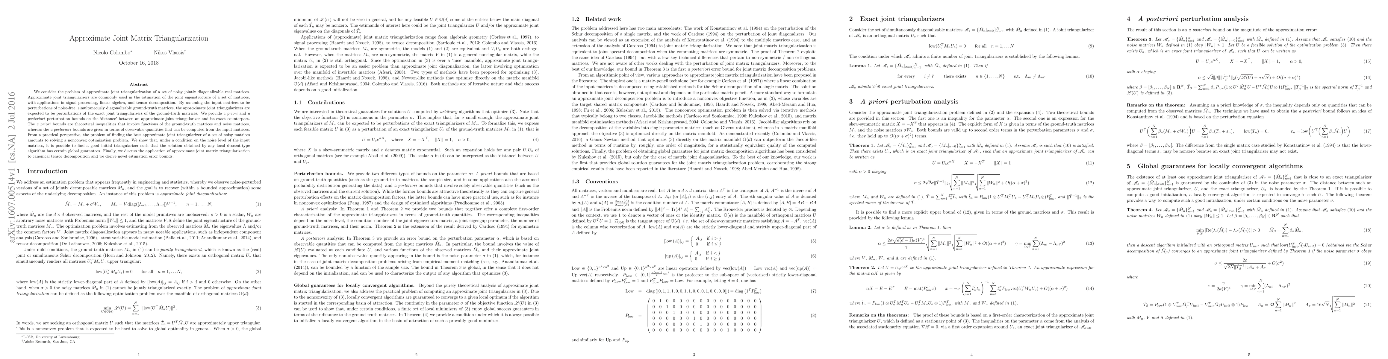 We consider the problem of approximate joint triangularization of a set of noisy jointly diagonalizable real matrices. Approximate joint triangularizers are commonly used in the estimation of the joint eigenstructure of a set of matrices, with applications in signal processing, linear algebra, and tensor decomposition. By assuming the input matrices to be perturbations of noise-free, simultaneously diagonalizable ground-truth matrices, the approximate joint triangularizers are expected to be perturbations of the exact joint triangularizers of the ground-truth matrices. We provide a priori and a posteriori perturbation bounds on the `distance' between an approximate joint triangularizer and its exact counterpart. The a priori bounds are theoretical inequalities that involve functions of the ground-truth matrices and noise matrices, whereas the a posteriori bounds are given in terms of observable quantities that can be computed from the input matrices. From a practical perspective, the problem of finding the best approximate joint triangularizer of a set of noisy matrices amounts to solving a nonconvex optimization problem. We show that, under a condition on the noise level of the input matrices, it is possible to find a good initial triangularizer such that the solution obtained by any local descent-type algorithm has certain global guarantees. Finally, we discuss the application of approximate joint matrix triangularization to canonical tensor decomposition and we derive novel estimation error bounds.