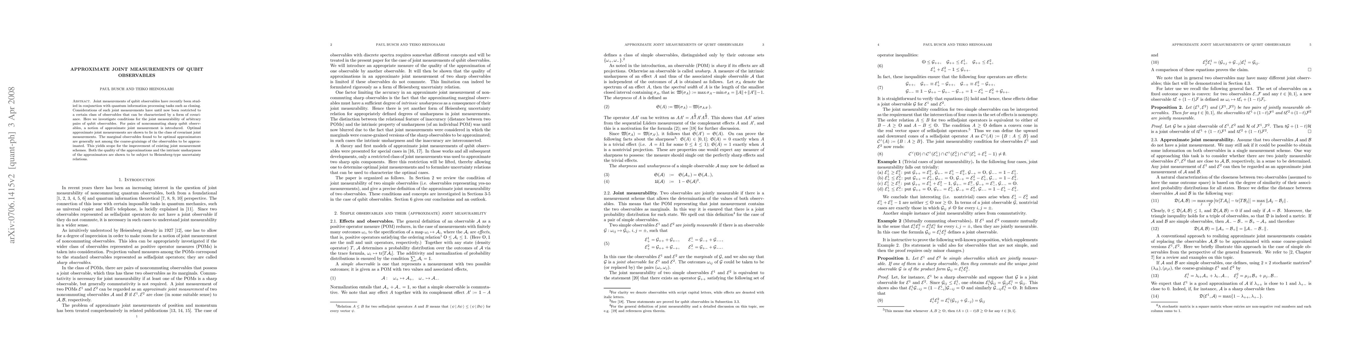 This paper investigates the conditions for joint measurability of arbitrary pairs of qubit observables, introducing a notion of approximate joint measurement for noncommuting observables. Optimal approximate joint measurements are shown to be covariant, often improving existing schemes, with the approximations subject to Heisenberg-type uncertainty relations.