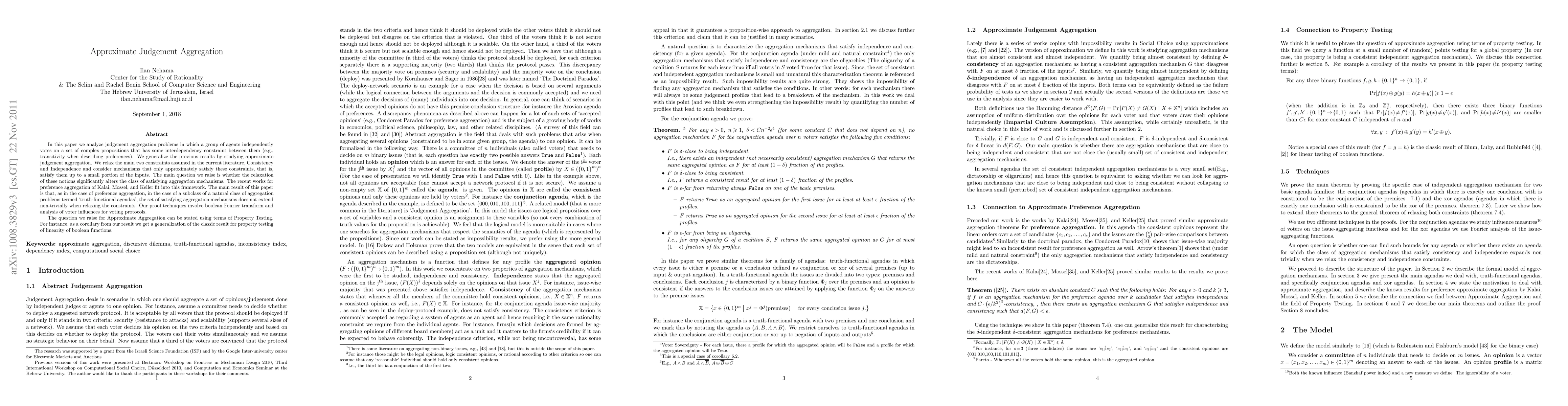 In this paper we analyze judgement aggregation problems in which a group of agents independently votes on a set of complex propositions that has some interdependency constraint between them(e.g., transitivity when describing preferences). We consider the issue of judgement aggregation from the perspective of approximation. That is, we generalize the previous results by studying approximate judgement aggregation. We relax the main two constraints assumed in the current literature, Consistency and Independence and consider mechanisms that only approximately satisfy these constraints, that is, satisfy them up to a small portion of the inputs. The main question we raise is whether the relaxation of these notions significantly alters the class of satisfying aggregation mechanisms. The recent works for preference aggregation of Kalai, Mossel, and Keller fit into this framework. The main result of this paper is that, as in the case of preference aggregation, in the case of a subclass of a natural class of aggregation problems termed `truth-functional agendas', the set of satisfying aggregation mechanisms does not extend non-trivially when relaxing the constraints. Our proof techniques involve Boolean Fourier transform and analysis of voter influences for voting protocols. The question we raise for Approximate Aggregation can be stated in terms of Property Testing. For instance, as a corollary from our result we get a generalization of the classic result for property testing of linearity of Boolean functions. An updated version (RePEc:huj:dispap:dp574R) is available at http://www.ratio.huji.ac.il/dp_files/dp574R.pdf