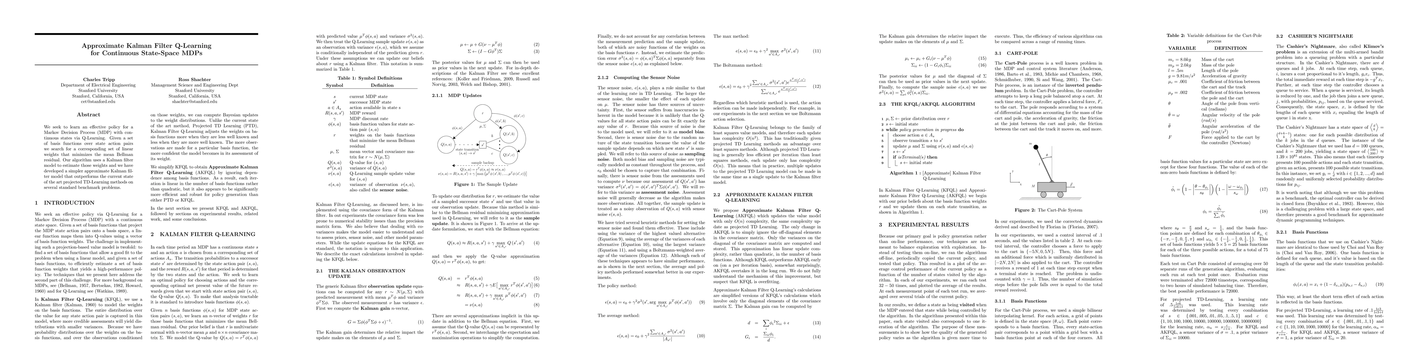 This paper proposes an approximate Kalman filter Q-Learning algorithm for continuous state-space Markov Decision Processes, utilizing a Kalman filter model to estimate optimal weights. This approach outperforms existing projected TD-Learning methods on benchmark problems.