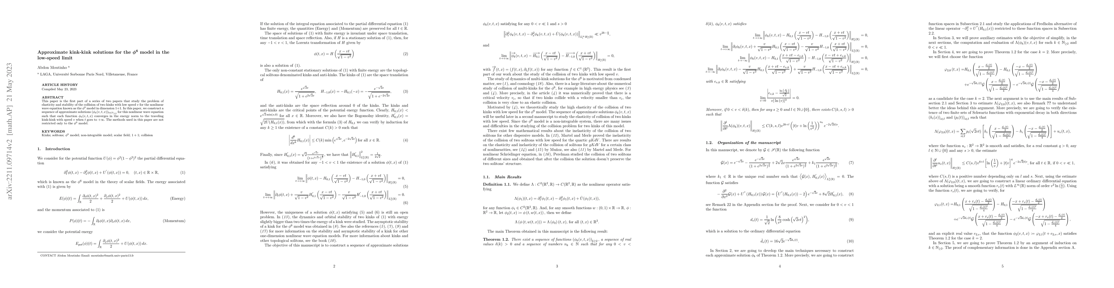 This paper constructs a sequence of approximate kink-kink solutions for the $\phi^{6}$ model's nonlinear wave equation, showing convergence to the traveling kink-kink at low speeds. The methods are applicable beyond the $\phi^{6}$ model.