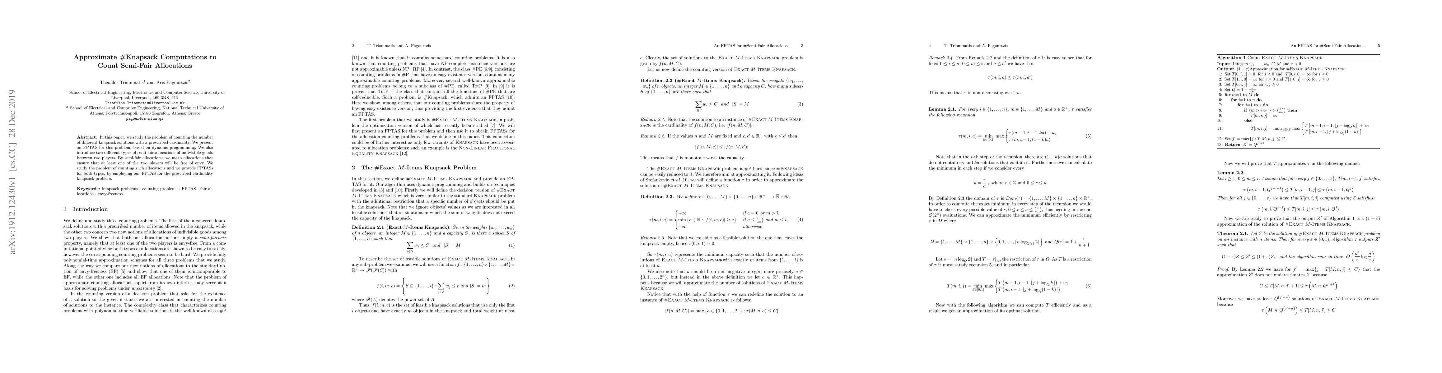 This paper presents an FPTAS for counting knapsack solutions with a fixed cardinality using dynamic programming, and introduces FPTASs for counting semi-fair allocations of indivisible goods between two players, ensuring at least one player is free of envy.