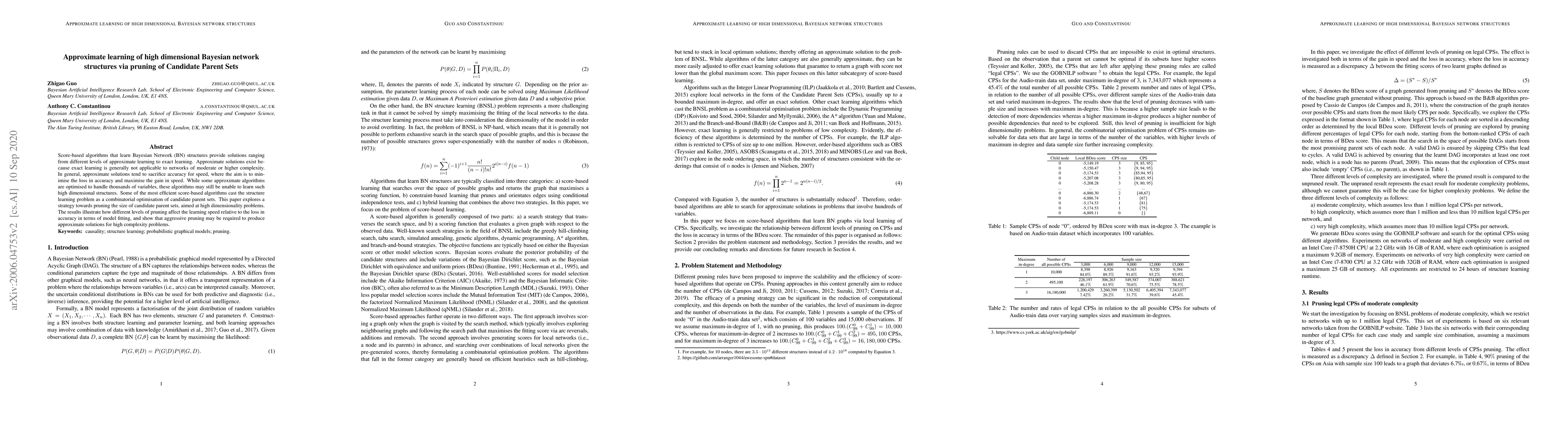 This paper proposes a method to approximate high-dimensional Bayesian network structures by efficiently pruning candidate parent sets, balancing speed and accuracy. The study finds that aggressive pruning can yield acceptable approximate solutions for complex networks, though it may incur some loss in model fitting accuracy.