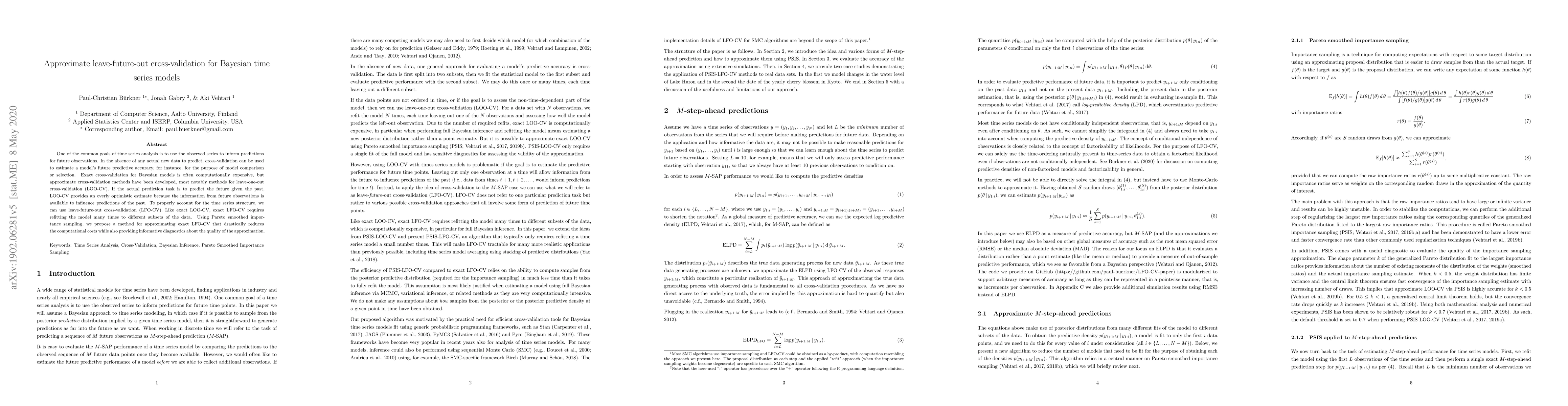 One of the common goals of time series analysis is to use the observed series to inform predictions for future observations. In the absence of any actual new data to predict, cross-validation can be used to estimate a model's future predictive accuracy, for instance, for the purpose of model comparison or selection. Exact cross-validation for Bayesian models is often computationally expensive, but approximate cross-validation methods have been developed, most notably methods for leave-one-out cross-validation (LOO-CV). If the actual prediction task is to predict the future given the past, LOO-CV provides an overly optimistic estimate because the information from future observations is available to influence predictions of the past. To properly account for the time series structure, we can use leave-future-out cross-validation (LFO-CV). Like exact LOO-CV, exact LFO-CV requires refitting the model many times to different subsets of the data. Using Pareto smoothed importance sampling, we propose a method for approximating exact LFO-CV that drastically reduces the computational costs while also providing informative diagnostics about the quality of the approximation.