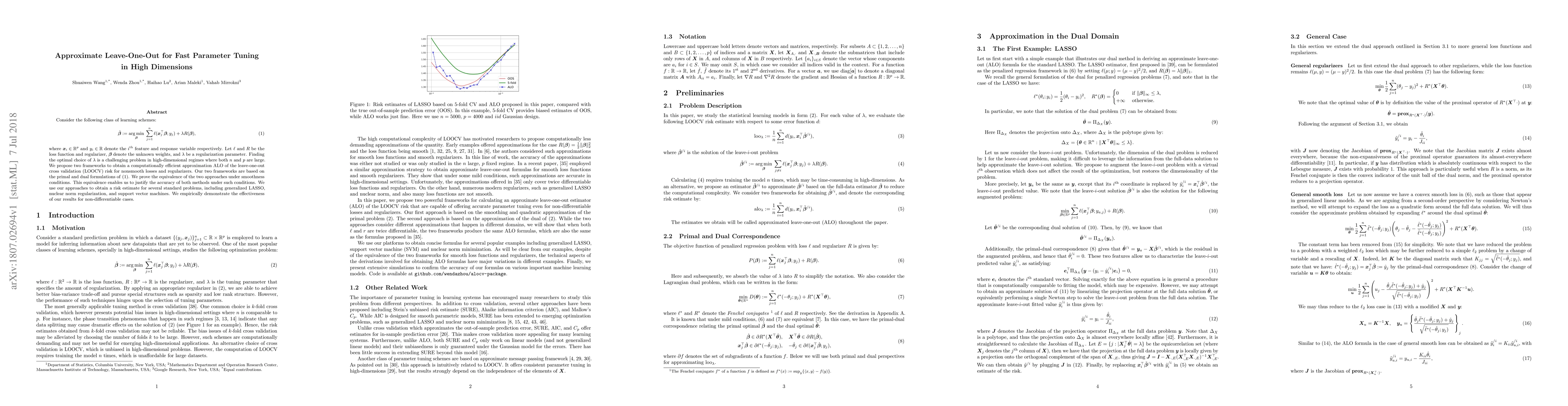 Consider the following class of learning schemes: $$\hat{\boldsymbol{\beta}} := \arg\min_{\boldsymbol{\beta}}\;\sum_{j=1}^n \ell(\boldsymbol{x}_j^\top\boldsymbol{\beta}; y_j) + \lambda R(\boldsymbol{\beta}),\qquad\qquad (1) $$ where $\boldsymbol{x}_i \in \mathbb{R}^p$ and $y_i \in \mathbb{R}$ denote the $i^{\text{th}}$ feature and response variable respectively. Let $\ell$ and $R$ be the loss function and regularizer, $\boldsymbol{\beta}$ denote the unknown weights, and $\lambda$ be a regularization parameter. Finding the optimal choice of $\lambda$ is a challenging problem in high-dimensional regimes where both $n$ and $p$ are large. We propose two frameworks to obtain a computationally efficient approximation ALO of the leave-one-out cross validation (LOOCV) risk for nonsmooth losses and regularizers. Our two frameworks are based on the primal and dual formulations of (1). We prove the equivalence of the two approaches under smoothness conditions. This equivalence enables us to justify the accuracy of both methods under such conditions. We use our approaches to obtain a risk estimate for several standard problems, including generalized LASSO, nuclear norm regularization, and support vector machines. We empirically demonstrate the effectiveness of our results for non-differentiable cases.