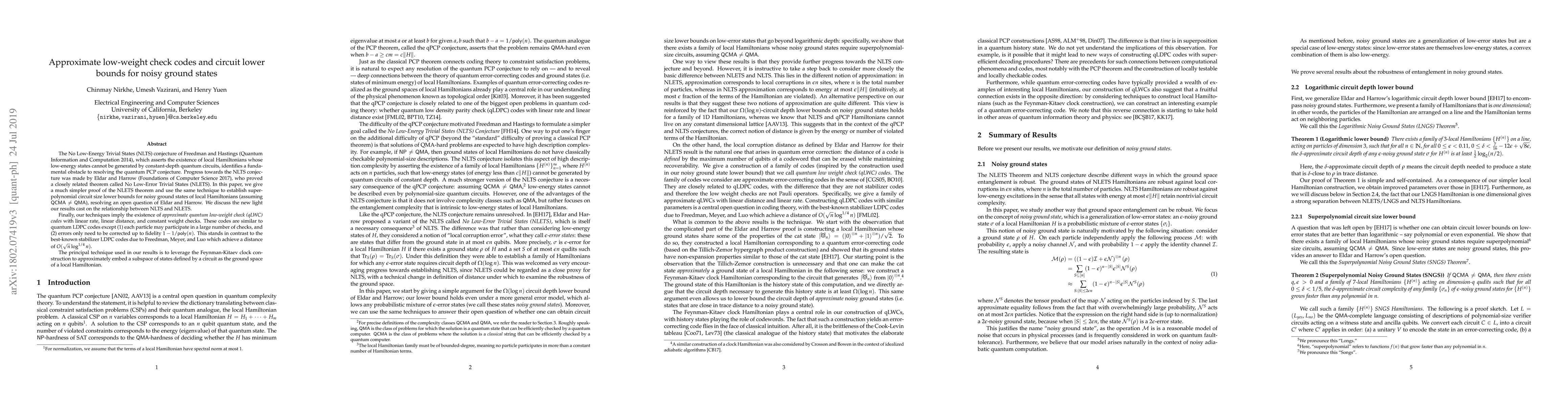This paper provides a simpler proof of the No Low-Error Trivial States (NLETS) theorem and uses it to establish superpolynomial circuit size lower bounds for noisy ground states of local Hamiltonians, resolving an open question. It also introduces approximate quantum low-weight check codes with linear rate and distance, contrasting with existing stabilizer LDPC codes. The key technique involves leveraging the Feynman-Kitaev clock construction.