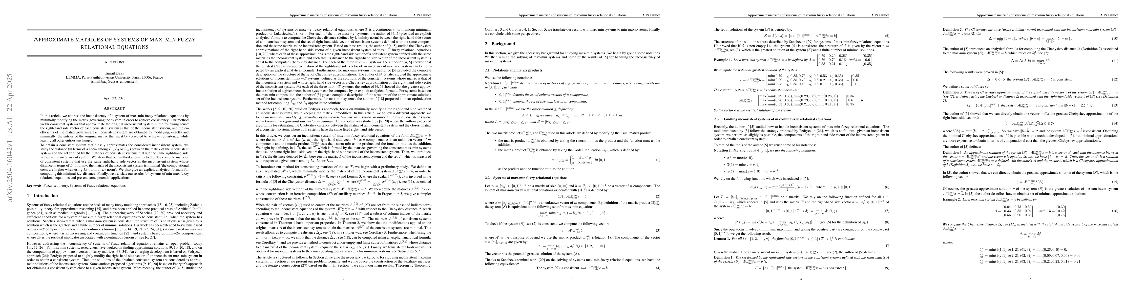The paper proposes a method to handle inconsistency in systems of max-min fuzzy relational equations by minimally modifying the governing matrix, ensuring that the right-hand side vector remains unchanged. It introduces tools for both max-min and min-max systems and studies the distance between the inconsistent matrix and the set of consistent matrices using L1, L2, or L∞ norms.