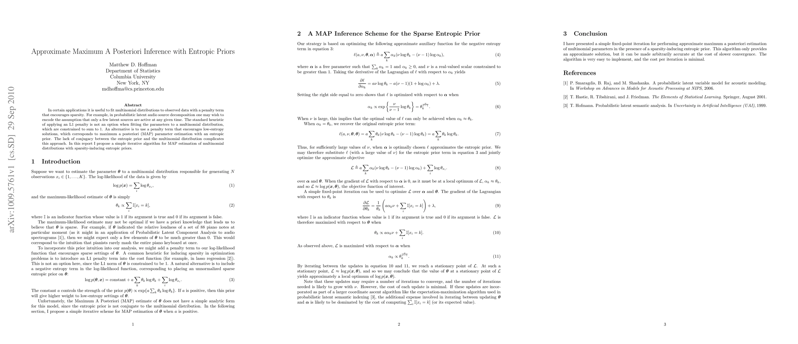 This paper proposes an iterative algorithm for approximate maximum a posteriori (MAP) inference of multinomial distributions with sparsity-inducing entropic priors, addressing the challenge of non-conjugacy between the entropic prior and the multinomial distribution. The method aims to fit multinomial distributions to observed data while encouraging sparsity, useful in applications like latent audio source decomposition.