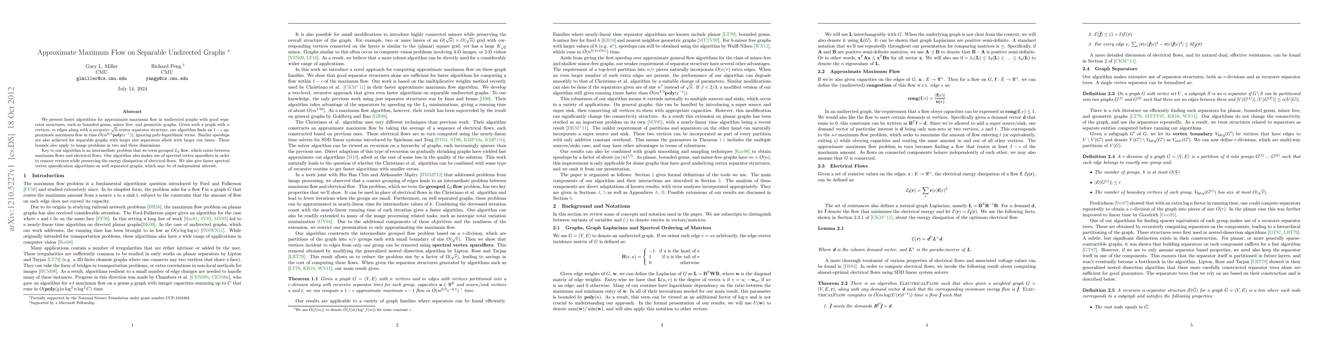 The research presents faster algorithms for approximate maximum flow in undirected graphs with good separator structures, utilizing a recursive $\sqrt{n}$-vertex separator structure and spectral vertex sparsifiers.