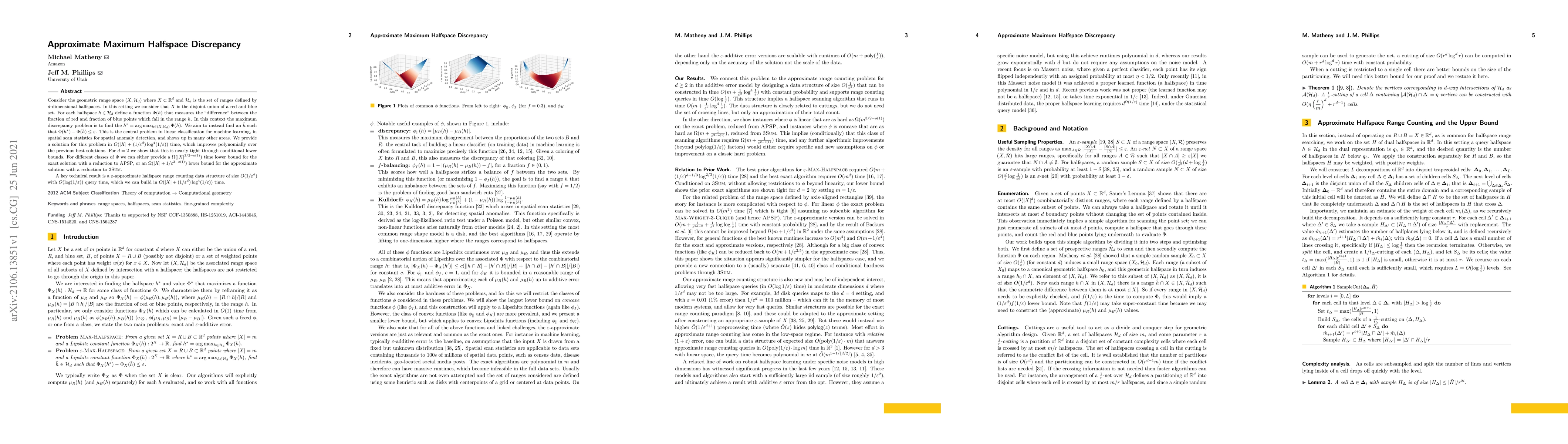 This paper addresses the approximate maximum halfspace discrepancy problem in geometric range spaces, providing an efficient algorithm that runs in $O(|X| + (1/\varepsilon^d) \log^4 (1/\varepsilon))$ time. It introduces an $\varepsilon$-approximate halfspace range counting data structure and establishes conditional lower bounds for both exact and approximate solutions.