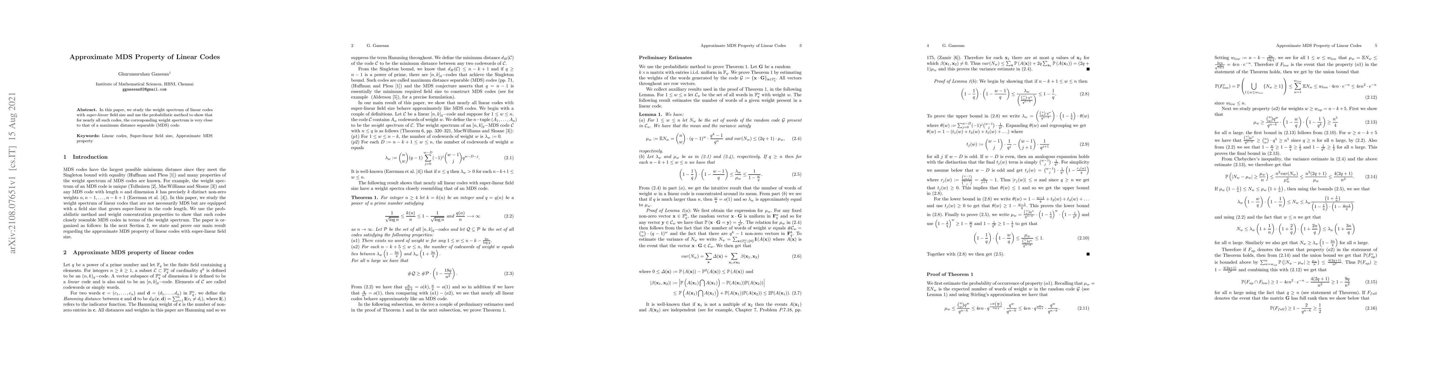 In this paper, we study the weight spectrum of linear codes with \emph{super-linear} field size and use the probabilistic method to show that for nearly all such codes, the corresponding weight spectrum is very close to that of a maximum distance separable (MDS) code.