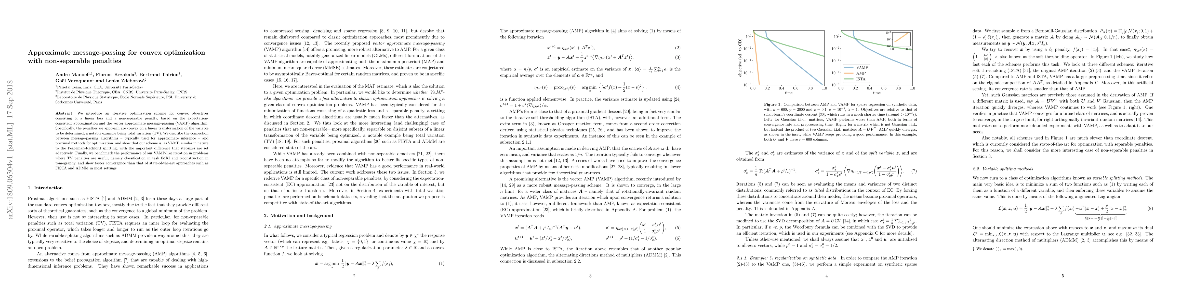 We introduce an iterative optimization scheme for convex objectives consisting of a linear loss and a non-separable penalty, based on the expectation-consistent approximation and the vector approximate message-passing (VAMP) algorithm. Specifically, the penalties we approach are convex on a linear transformation of the variable to be determined, a notable example being total variation (TV). We describe the connection between message-passing algorithms -- typically used for approximate inference -- and proximal methods for optimization, and show that our scheme is, as VAMP, similar in nature to the Peaceman-Rachford splitting, with the important difference that stepsizes are set adaptively. Finally, we benchmark the performance of our VAMP-like iteration in problems where TV penalties are useful, namely classification in task fMRI and reconstruction in tomography, and show faster convergence than that of state-of-the-art approaches such as FISTA and ADMM in most settings.