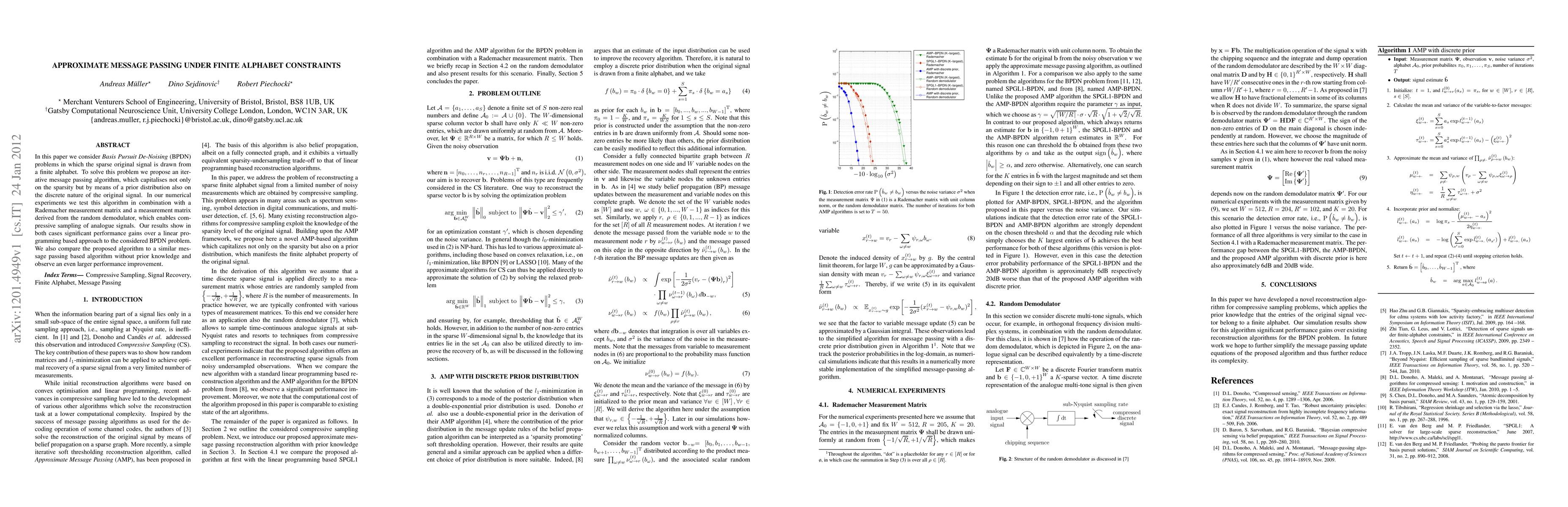 Researchers propose an improved message passing algorithm for Basis Pursuit De-Noising problems with finite alphabet constraints, achieving significant performance gains over traditional methods.