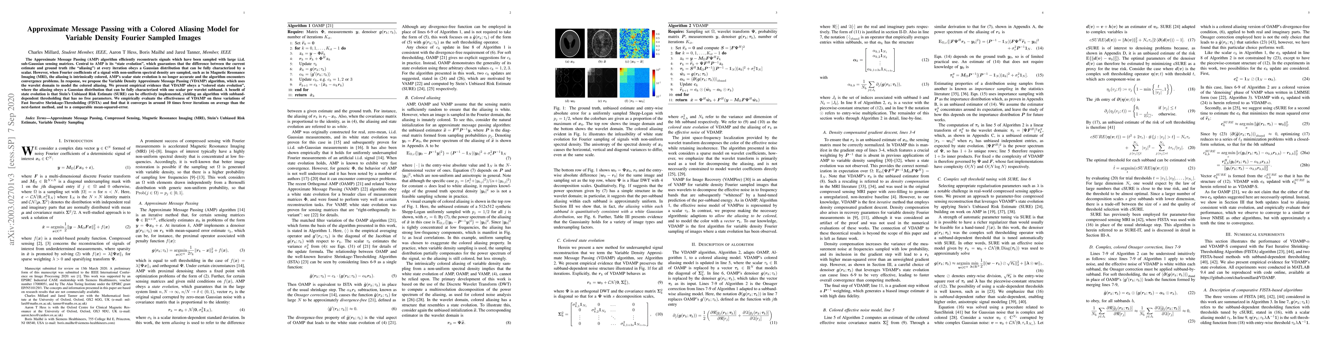 The paper proposes the Variable Density Approximate Message Passing (VDAMP) algorithm to address convergence issues in the AMP algorithm when reconstructing images sampled with non-uniform spectral density, like in MRI. VDAMP models colored aliasing in the wavelet domain, achieving a "colored state evolution" and enabling effective implementation of Stein's Unbiased Risk Estimate (SURE) for subband-dependent thresholding, resulting in faster convergence compared to other methods.
