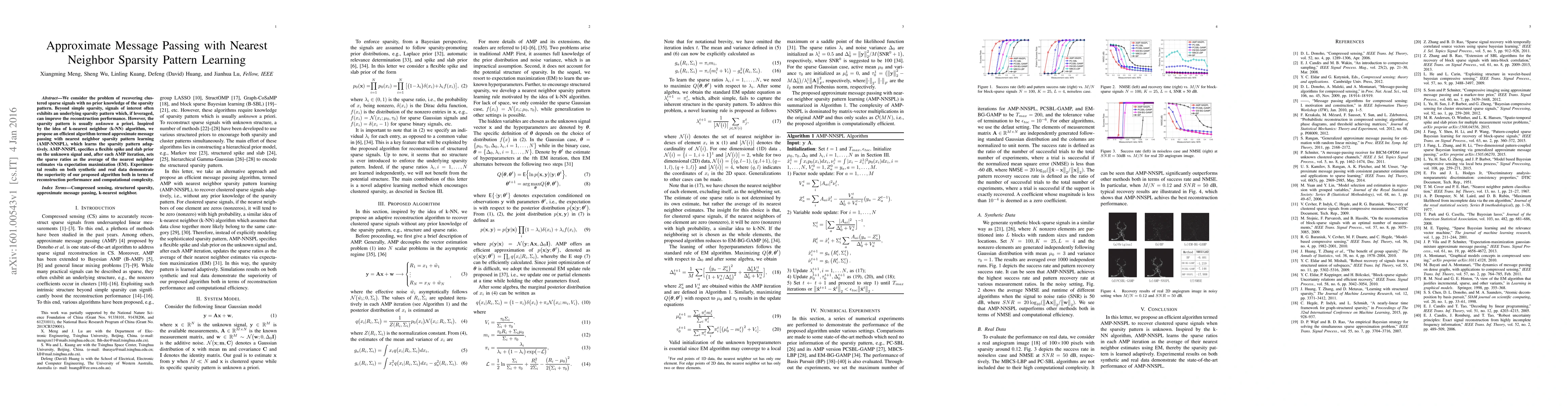 This paper proposes AMP-NNSPL, an algorithm that adaptively learns the sparsity pattern for clustered sparse signals using k-nearest neighbor ideas. It demonstrates superior reconstruction performance and computational efficiency compared to existing methods on both synthetic and real datasets.