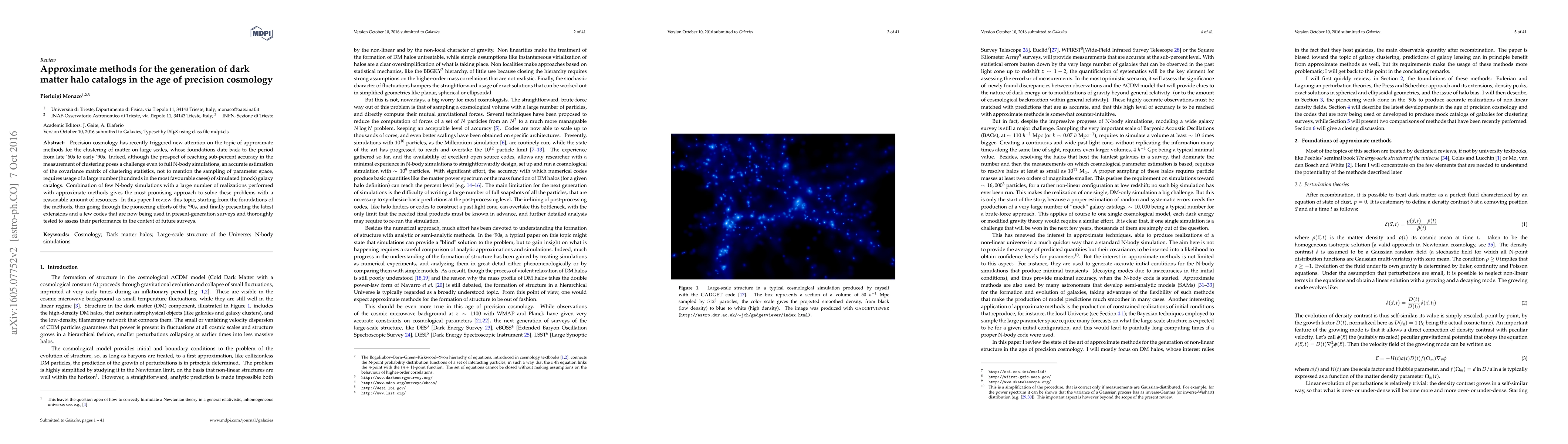 This paper reviews approximate methods for generating dark matter halo catalogs, emphasizing their importance in precision cosmology. It traces the historical development of these methods and discusses their application in modern surveys and their role in efficiently estimating clustering statistics and sampling parameter space.