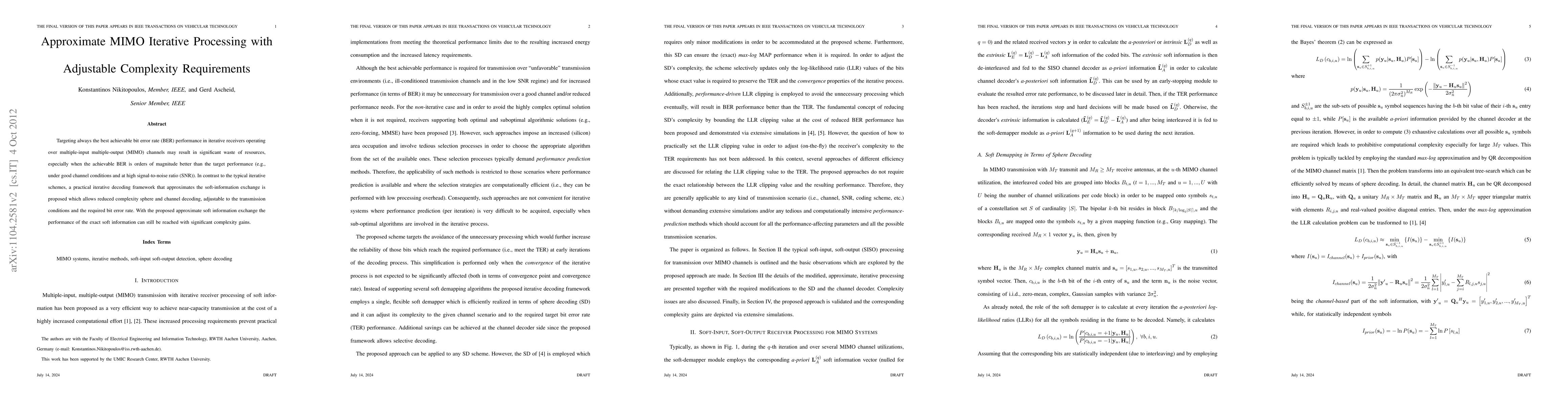 Targeting always the best achievable bit error rate (BER) performance in iterative receivers operating over multiple-input multiple-output (MIMO) channels may result in significant waste of resources, especially when the achievable BER is orders of magnitude better than the target performance (e.g., under good channel conditions and at high signal-to-noise ratio (SNR)). In contrast to the typical iterative schemes, a practical iterative decoding framework that approximates the soft-information exchange is proposed which allows reduced complexity sphere and channel decoding, adjustable to the transmission conditions and the required bit error rate. With the proposed approximate soft information exchange the performance of the exact soft information can still be reached with significant complexity gains.