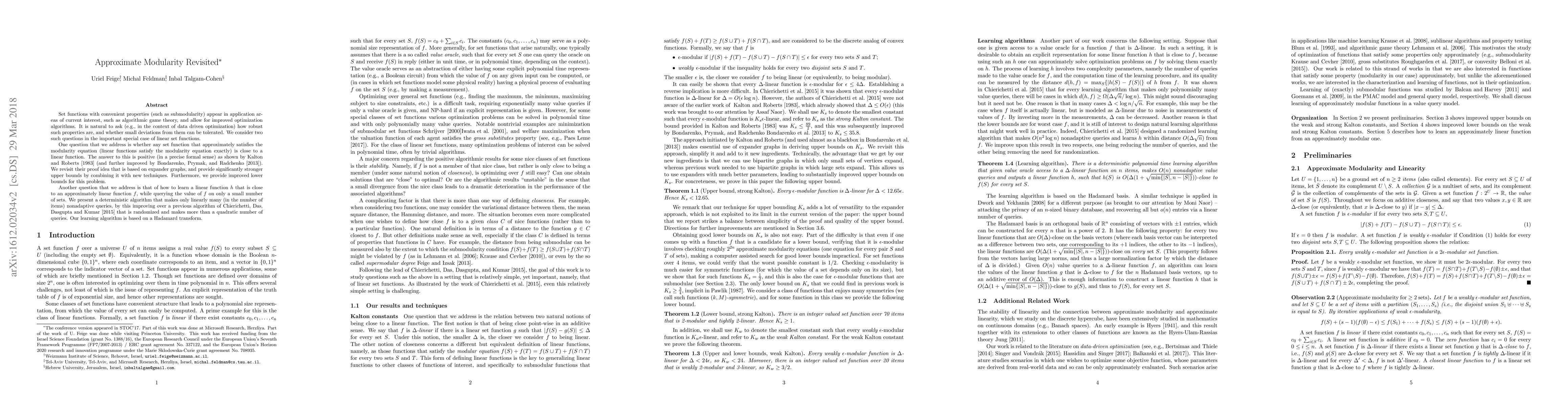 This paper revisits the robustness of modularity in linear set functions, showing that approximately modular functions are close to linear ones with improved bounds using expander graphs. It also presents a deterministic algorithm for learning approximately linear functions with fewer queries than previous methods, utilizing a Hadamard transform.