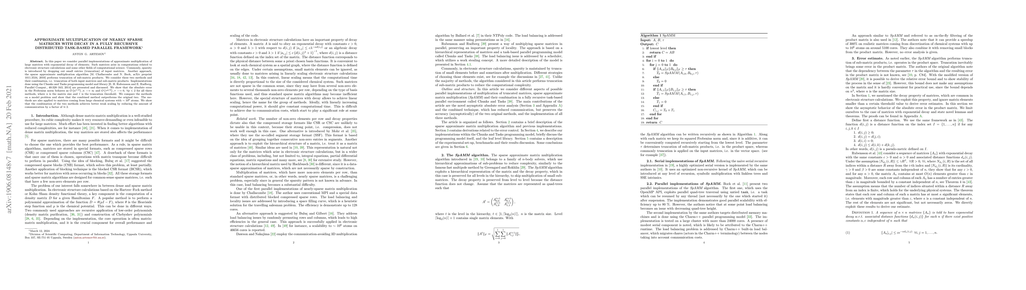 This paper explores parallel implementations for approximate multiplication of large, nearly sparse matrices with exponential decay, focusing on electronic structure calculations. It compares truncation methods and their combination, implemented in a distributed task-based framework, showing that the combined method achieves better performance and reduced communication overhead.