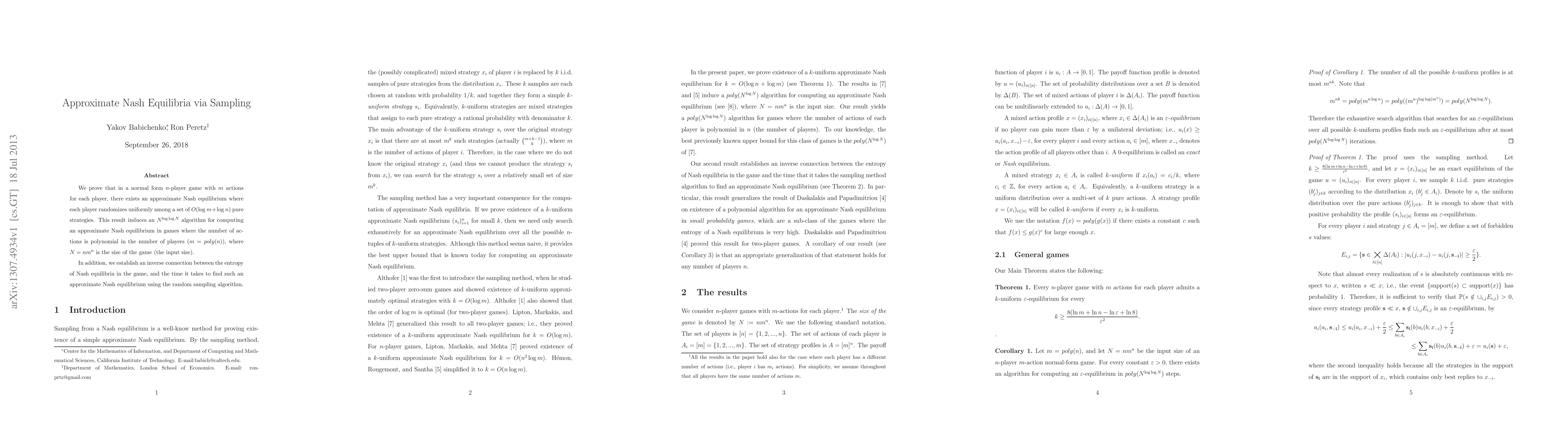 This paper demonstrates that an approximate Nash equilibrium in n-player games can be found by each player randomizing among a set of O(log(m) + log(n)) strategies, leading to an $N^{\log \log N}$ algorithm for such games. It also links the entropy of Nash equilibria to the efficiency of finding these equilibria via random sampling.