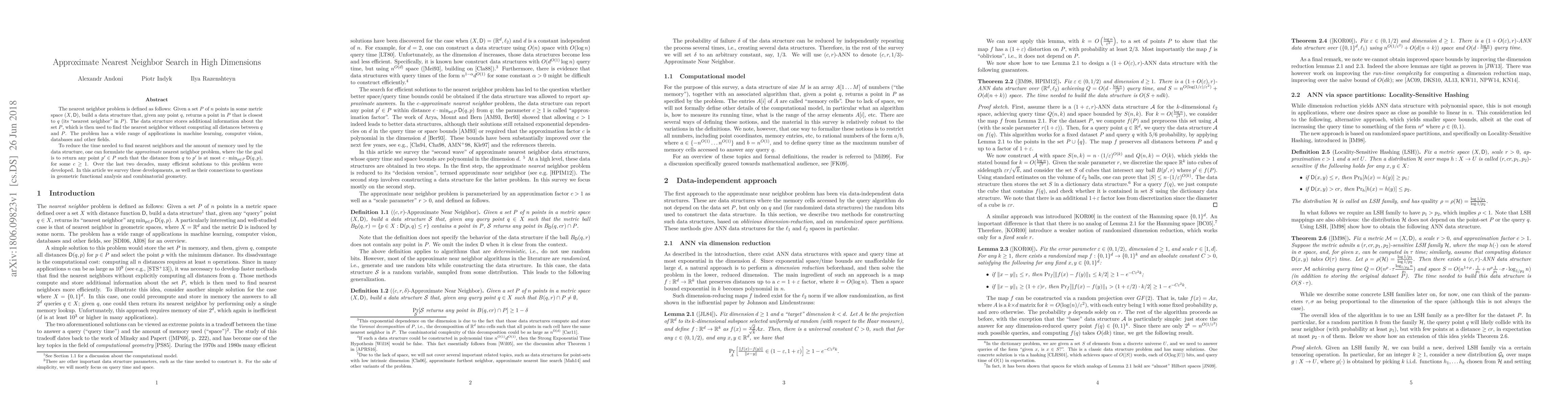 This paper surveys efficient solutions to the approximate nearest neighbor problem in high-dimensional spaces, focusing on methods that reduce search time and memory usage while returning points within a multiplicative factor of the true nearest neighbor. It also explores connections to geometric functional analysis and combinatorial geometry.