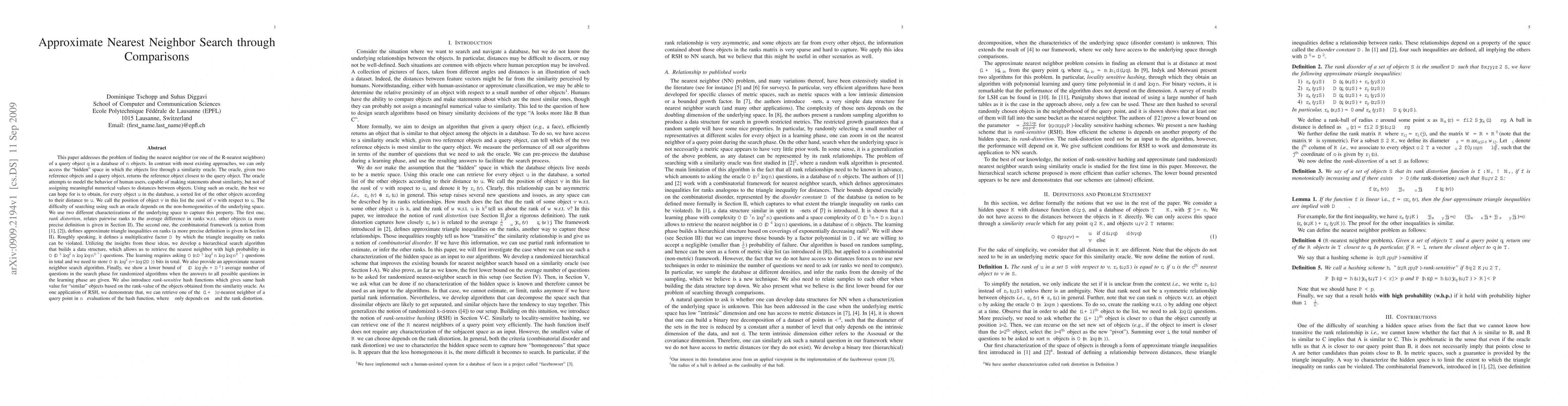This paper addresses the problem of finding the nearest neighbor (or one of the R-nearest neighbors) of a query object q in a database of n objects. In contrast with most existing approaches, we can only access the ``hidden'' space in which the objects live through a similarity oracle. The oracle, given two reference objects and a query object, returns the reference object closest to the query object. The oracle attempts to model the behavior of human users, capable of making statements about similarity, but not of assigning meaningful numerical values to distances between objects.