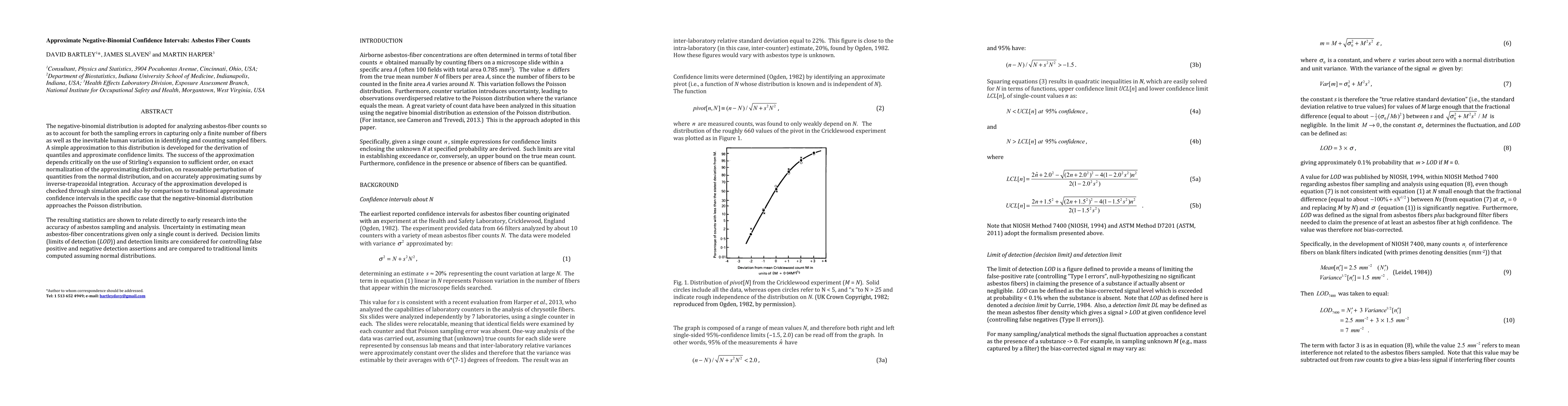 The negative-binomial distribution is adopted for analyzing asbestos-fiber counts so as to account for both the sampling errors in capturing only a finite number of fibers as well as the inevitable human variation in identifying and counting sampled fibers. A simple approximation to this distribution is developed for the derivation of quantiles and approximate confidence limits. The success of the approximation depends critically on the use of the Stirling expansion to sufficient order, on exact normalization of the approximating distribution, on reasonable perturbation of quantities from the normal distribution, and on accurately approximating sums by inverse-trapezoidal integration. Accuracy of the approximation developed is checked through simulation and also by comparison to traditional approximate confidence intervals in the specific case that the negative-binomial distribution approaches the Poisson distribution. The resulting statistics are shown to relate directly to early research into the accuracy of asbestos sampling and analysis. Uncertainty in estimating mean asbestos-fiber concentrations given only a single count is derived. Decision limits (limits of detection (LOD)) and detection limits are considered for controlling false positive and negative detection assertions and are compared to traditional limits computed assuming normal distributions.
