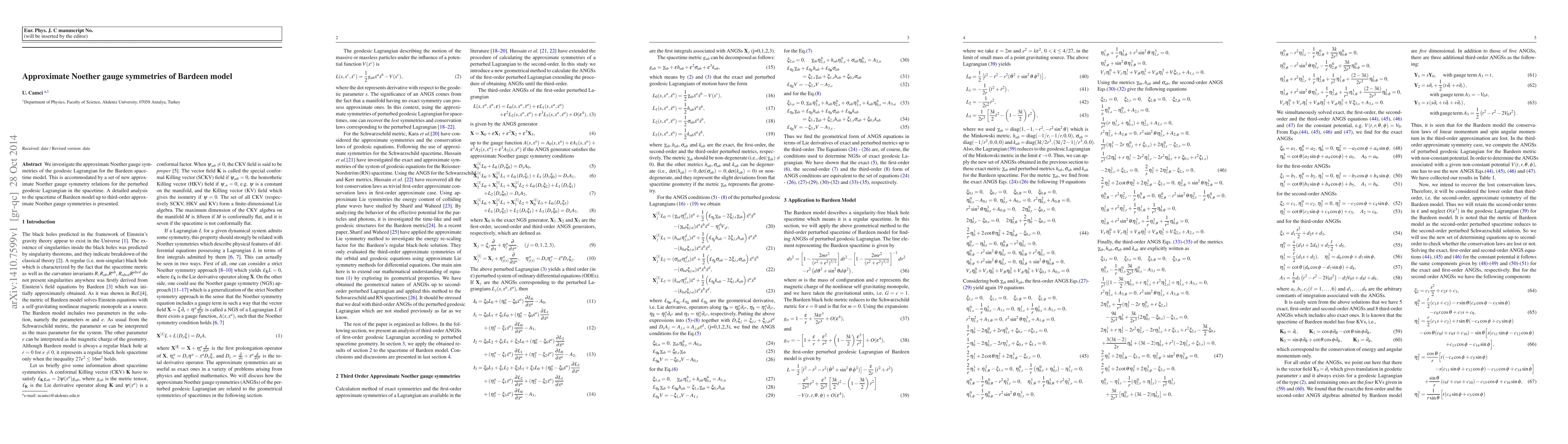 This paper explores the approximate Noether gauge symmetries of the Bardeen spacetime model's geodesic Lagrangian, introducing new symmetry relations for the perturbed Lagrangian. A comprehensive analysis of these symmetries up to third-order is provided.