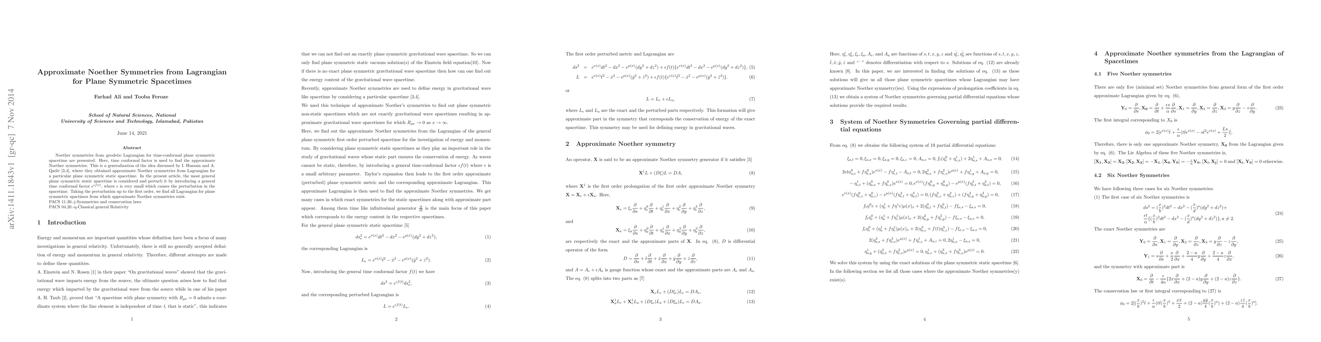 Noether symmetries from geodetic Lagrangian for time-conformal plane symmetric spacetime are presented. Here, time conformal factor is used to find the approximate Noether symmetries. This is a generalization of the idea discussed by I. Hussain and A. Noether symmetries from geodetic Lagrangian for time-conformal plane symmetric spacetime are presented. Here, time conformal factor is used to find the approximate Noether symmetries. This is a generalization of the idea discussed by I. Hussain and A. Qadir [3,4], where they obtained approximate Noether symmetries from Lagrangian for a particular plane symmetric static spacetime. In the present article, the most general plane symmetric static spacetime is considered and perturb it by introducing a general time conformal factor $e^{\epsilon f(t)}$, where $\epsilon$ is very small which causes the perturbation in the spacetime. Taking the perturbation up to the first order, we find all Lagrangian for plane symmetric spactimes from which approximate Noether symmetries exist. PACS 11.30.-j-Symmetries and conservation laws PACS 04.20.-q-Classical general Relativity