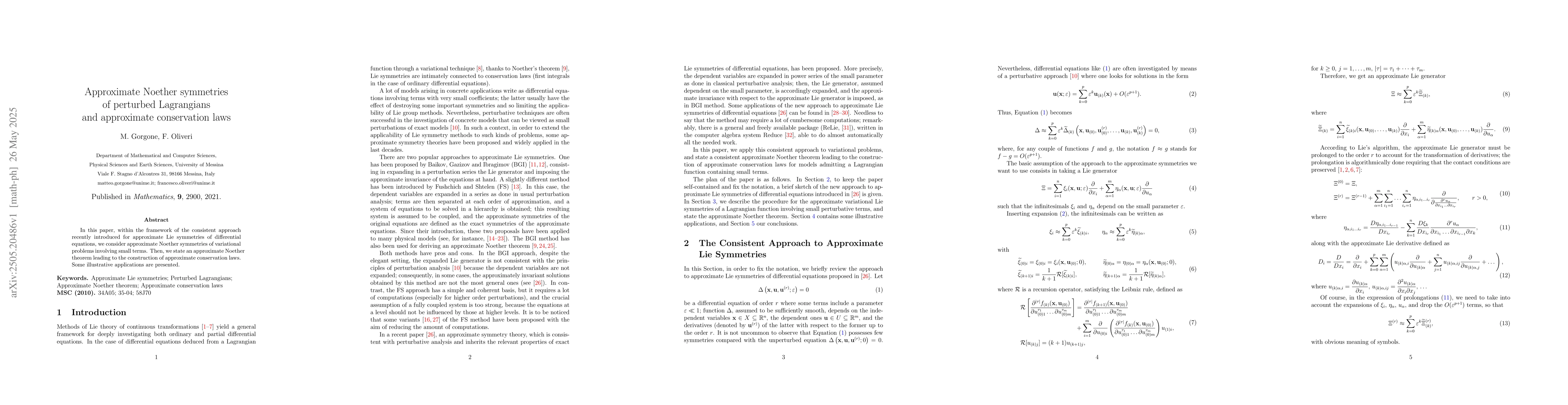 The paper presents an approximate Noether theorem leading to the construction of approximate conservation laws for perturbed Lagrangians, extending previous work on approximate symmetries.