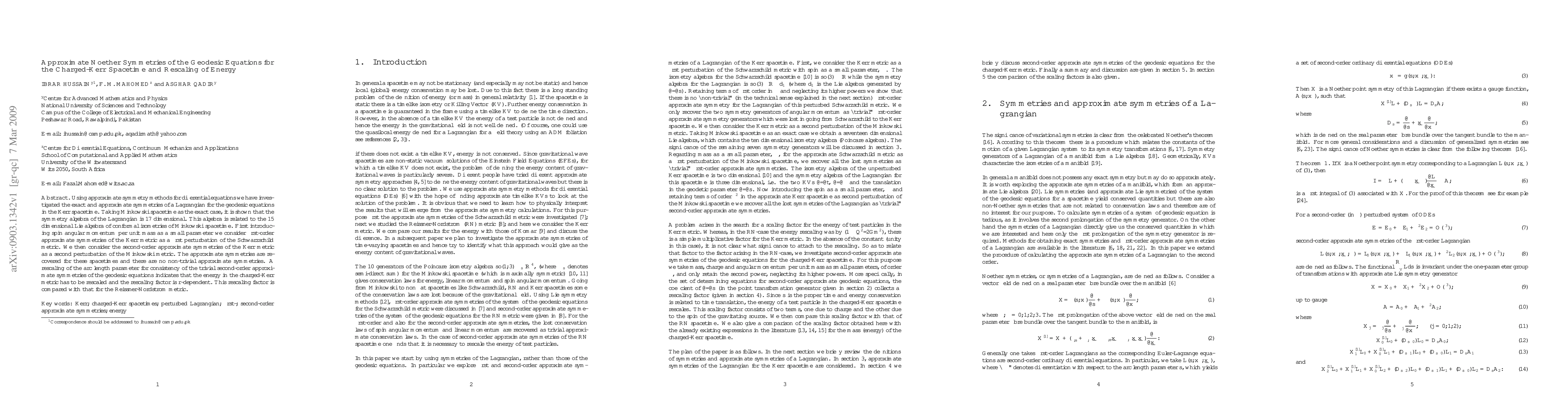 This paper investigates the exact and approximate symmetries of the Lagrangian for geodesic equations in the Kerr spacetime using approximate symmetry methods. It finds a 17-dimensional symmetry algebra related to the 15-dimensional Lie algebra of conformal isometries in Minkowski spacetime, and concludes that the charged-Kerr metric requires an $r$-dependent rescaling factor for energy consistency.