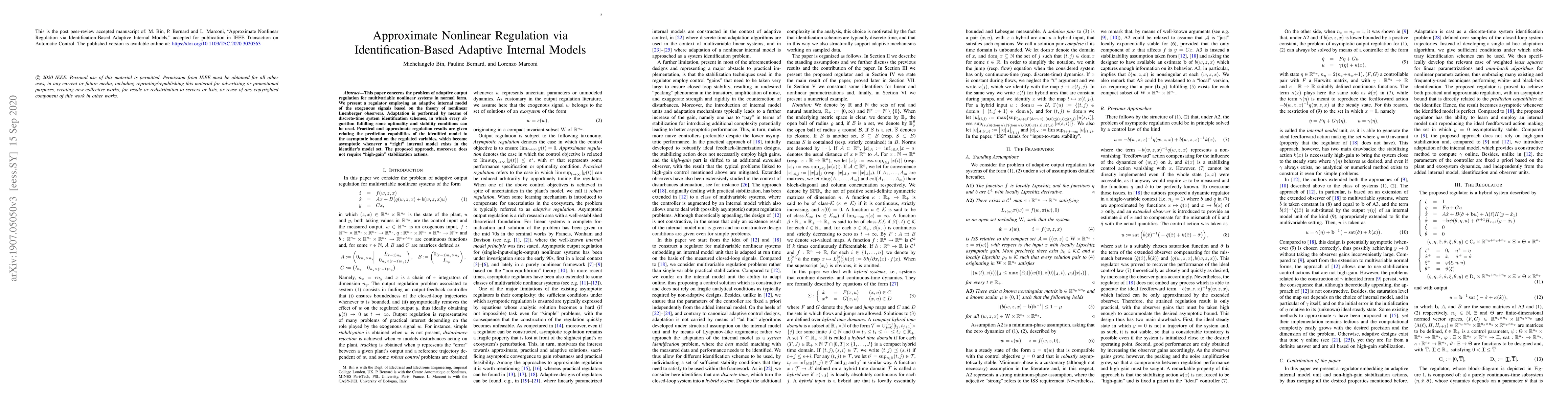 This paper proposes an adaptive internal model regulator for multivariable nonlinear systems, utilizing system identification to adapt to exogenous signals without high-gain stabilization, achieving practical and approximate regulation based on the identified model's prediction capabilities.