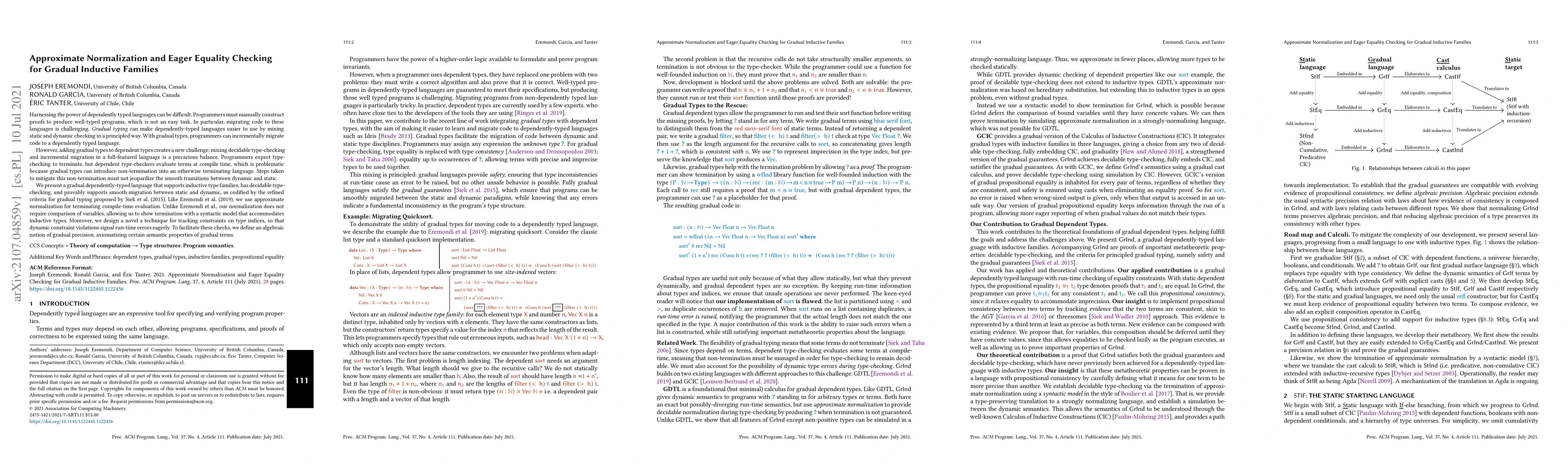 This paper introduces a gradual dependently-typed language that supports inductive type families, enabling smooth migration from dynamic to static typing. It employs approximate normalization to ensure decidable and terminating type-checking, while avoiding variable comparisons to maintain a syntactic model that accommodates inductive types.