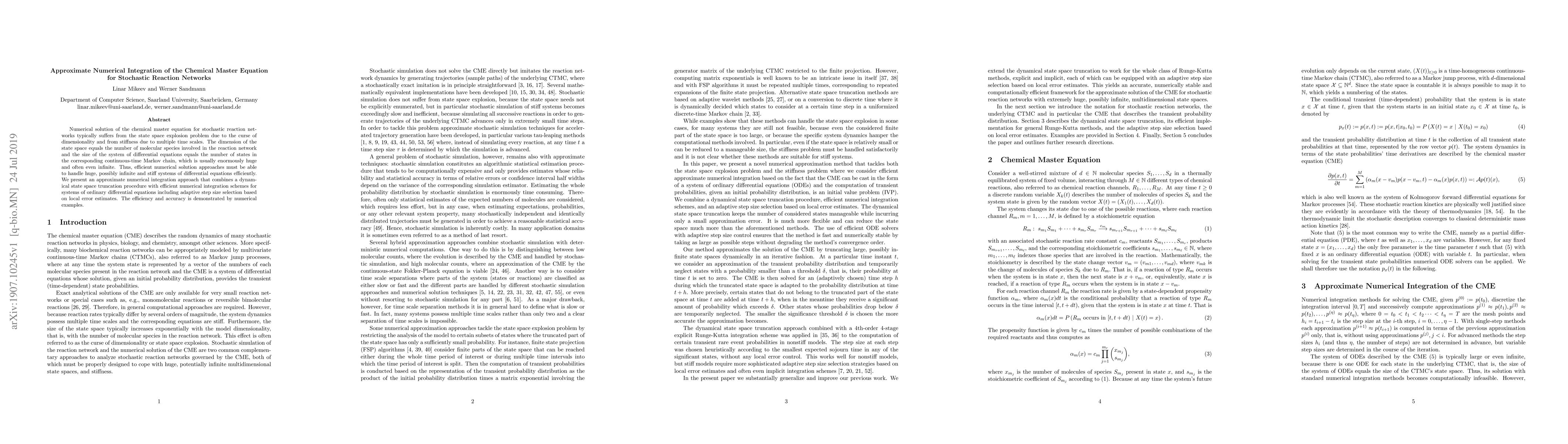This paper proposes an approximate numerical integration method for solving the chemical master equation in stochastic reaction networks, addressing the state space explosion and stiffness issues. The approach combines dynamical state space truncation with adaptive step size integration schemes, demonstrating efficiency and accuracy through numerical examples.