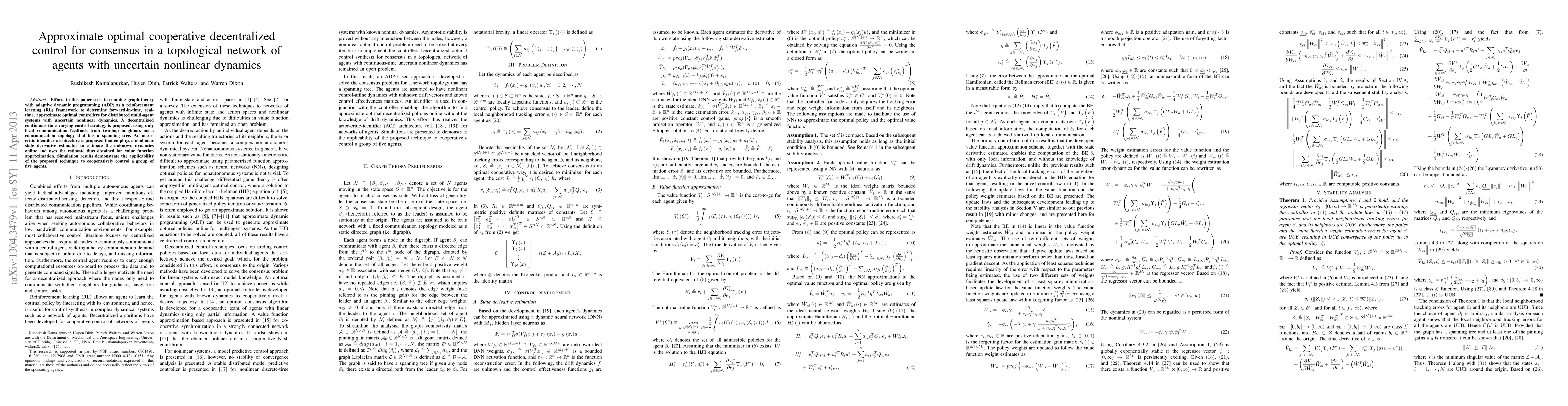 Efforts in this paper seek to combine graph theory with adaptive dynamic programming (ADP) as a reinforcement learning (RL) framework to determine forward-in-time, real-time, approximate optimal controllers for distributed multi-agent systems with uncertain nonlinear dynamics. A decentralized continuous time-varying control strategy is proposed, using only local communication feedback from two-hop neighbors on a communication topology that has a spanning tree. An actor-critic-identifier architecture is proposed that employs a nonlinear state derivative estimator to estimate the unknown dynamics online and uses the estimate thus obtained for value function approximation.