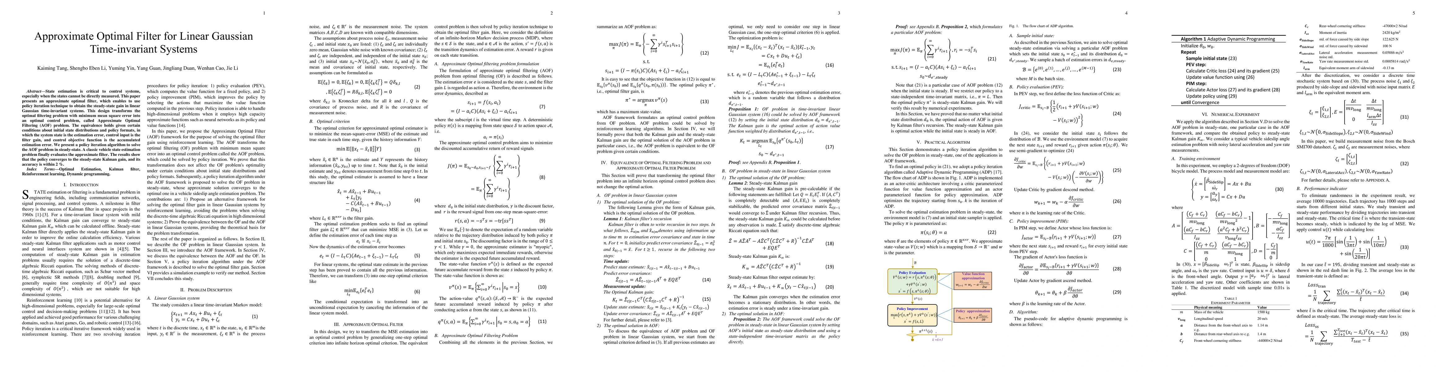 State estimation is critical to control systems, especially when the states cannot be directly measured. This paper presents an approximate optimal filter, which enables to use policy iteration technique to obtain the steady-state gain in linear Gaussian time-invariant systems. This design transforms the optimal filtering problem with minimum mean square error into an optimal control problem, called Approximate Optimal Filtering (AOF) problem. The equivalence holds given certain conditions about initial state distributions and policy formats, in which the system state is the estimation error, control input is the filter gain, and control objective function is the accumulated estimation error. We present a policy iteration algorithm to solve the AOF problem in steady-state. A classic vehicle state estimation problem finally evaluates the approximate filter. The results show that the policy converges to the steady-state Kalman gain, and its accuracy is within 2 %.