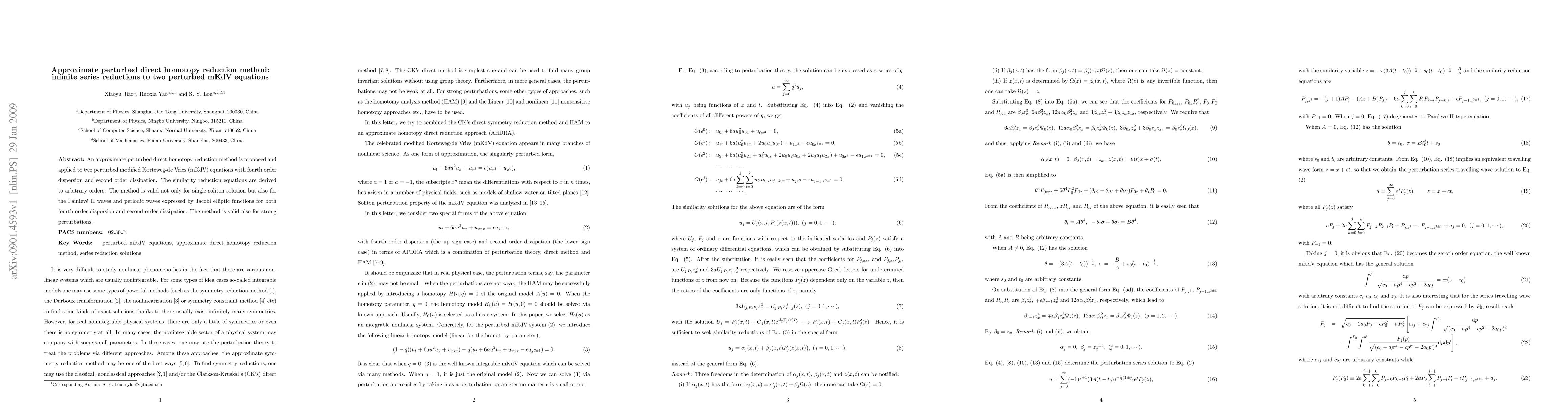 An approximate perturbed direct homotopy reduction method is proposed and applied to two perturbed modified Korteweg-de Vries (mKdV) equations with fourth order dispersion and second order dissipation. The similarity reduction equations are derived to arbitrary orders. The method is valid not only for single soliton solution but also for the Painlev\'e II waves and periodic waves expressed by Jacobi elliptic functions for both fourth order dispersion and second order dissipation. The method is valid also for strong perturbations.