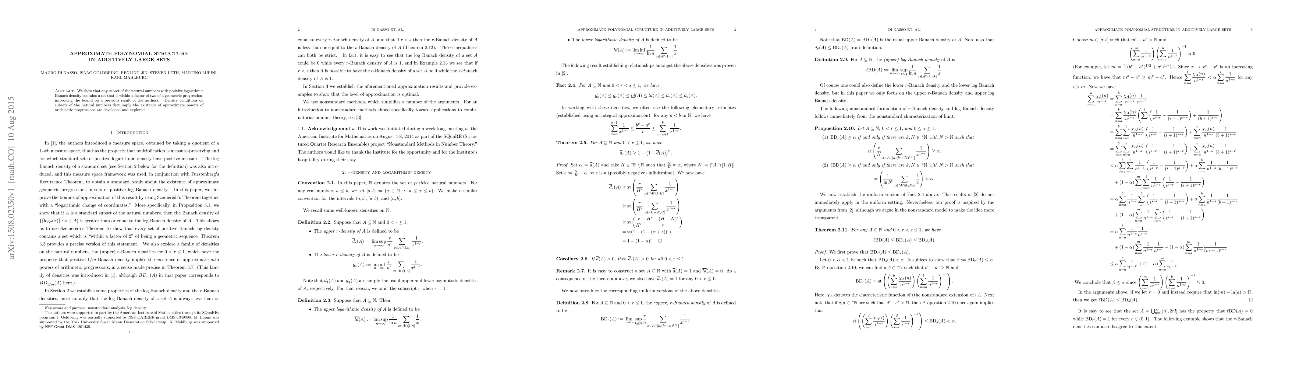We show that any subset of the natural numbers with positive logarithmic Banach density contains a set that is within a factor of two of a geometric progression, improving the bound on a previous result of the authors. Density conditions on subsets of the natural numbers that imply the existence of approximate powers of arithmetic progressions are developed and explored.