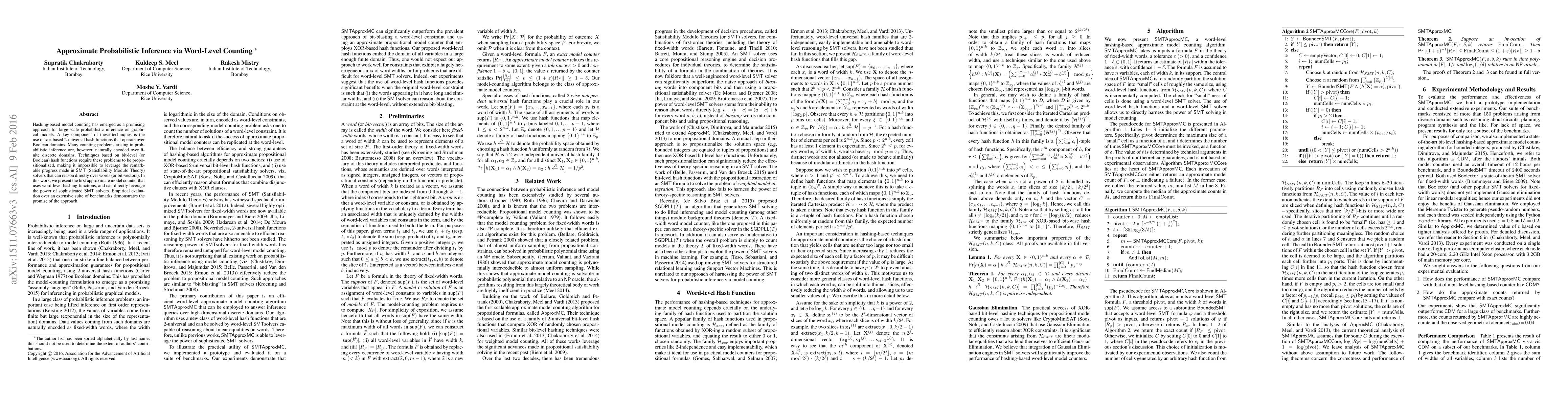 This paper introduces an approximate model counter utilizing word-level hashing functions to perform large-scale probabilistic inference on graphical models, bypassing the need for propositionalization and enabling direct use of SMT solvers. Empirical results show the effectiveness of this novel approach.
