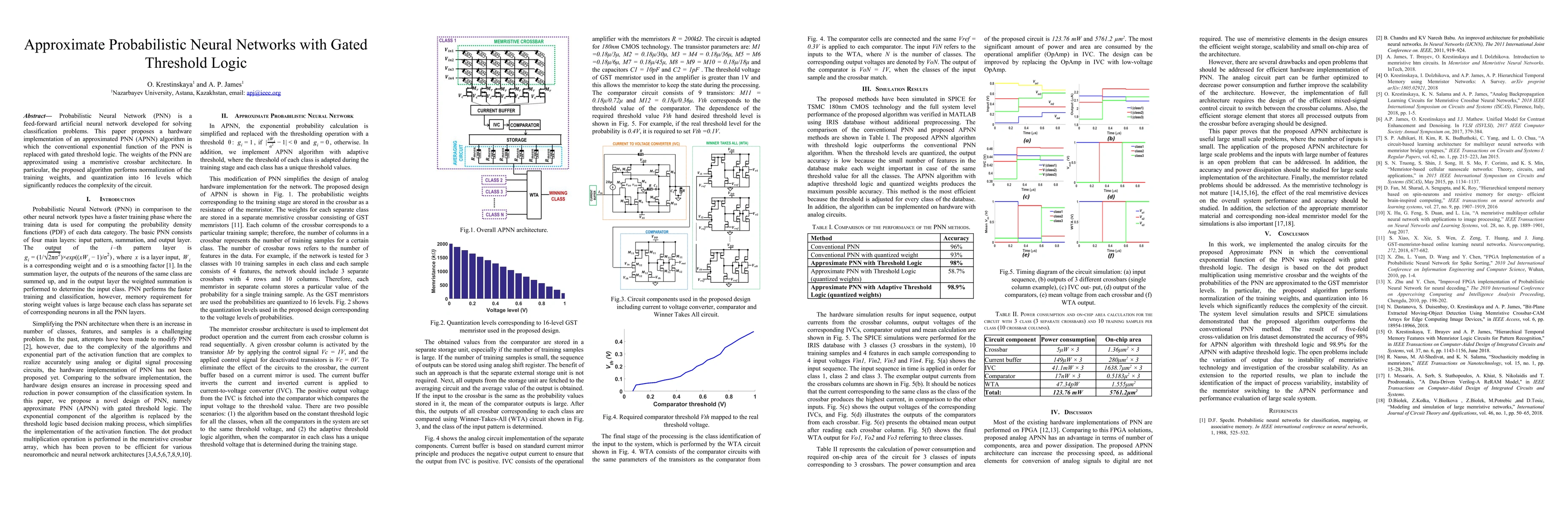 Probabilistic Neural Network (PNN) is a feed-forward artificial neural network developed for solving classification problems. This paper proposes a hardware implementation of an approximated PNN (APNN) algorithm in which the conventional exponential function of the PNN is replaced with gated threshold logic. The weights of the PNN are approximated using a memristive crossbar architecture. In particular, the proposed algorithm performs normalization of the training weights, and quantization into 16 levels which significantly reduces the complexity of the circuit.